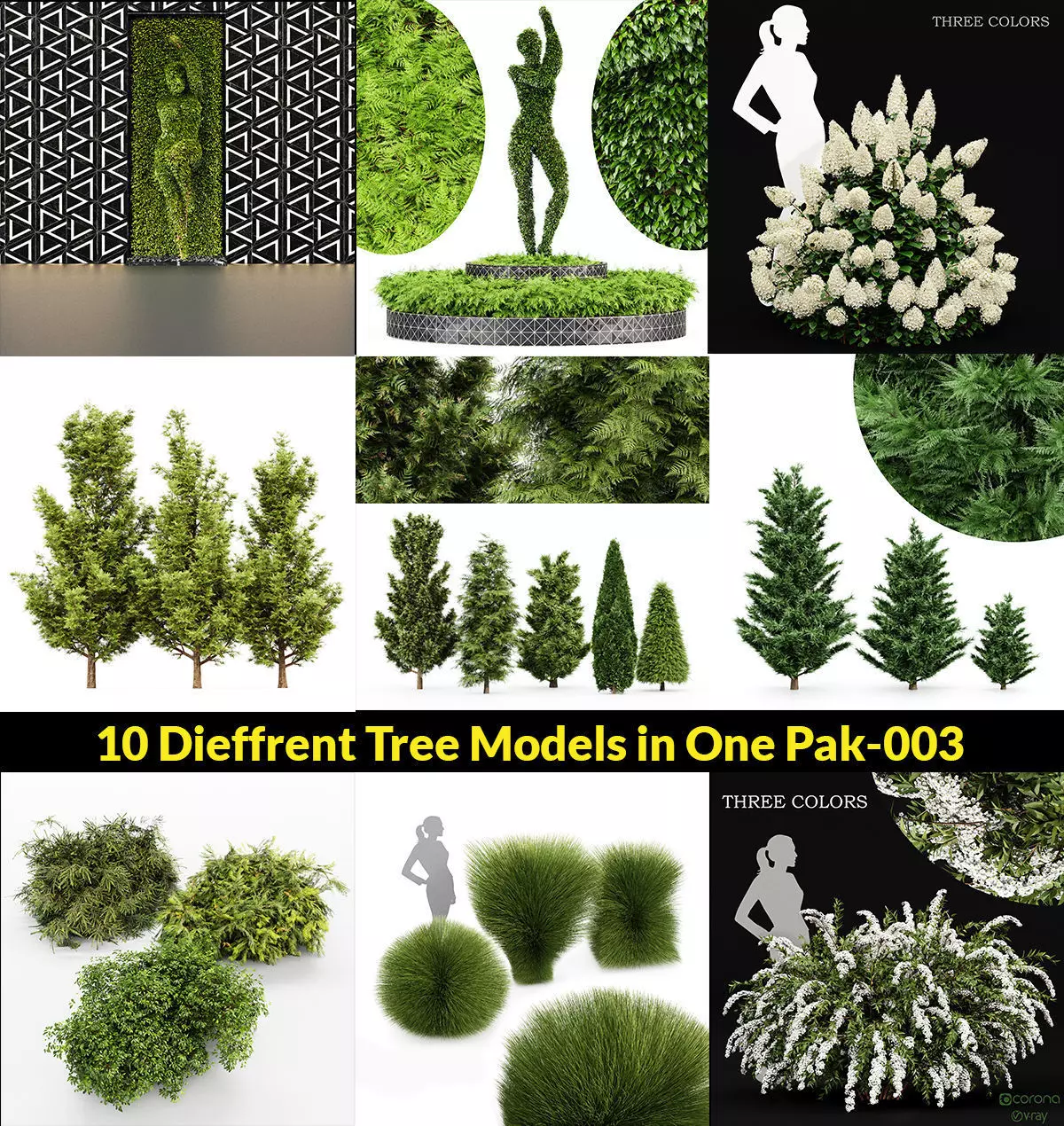 5Different tree-Leyland cypress-Slender Hinoki-Rocky Mountain-green coniferous-Cupressocyparis(Polys: 1.131k+Verts: 1.636k+Models height(Left to right): 640cm,560cm,520cm,550cm, 400cm)