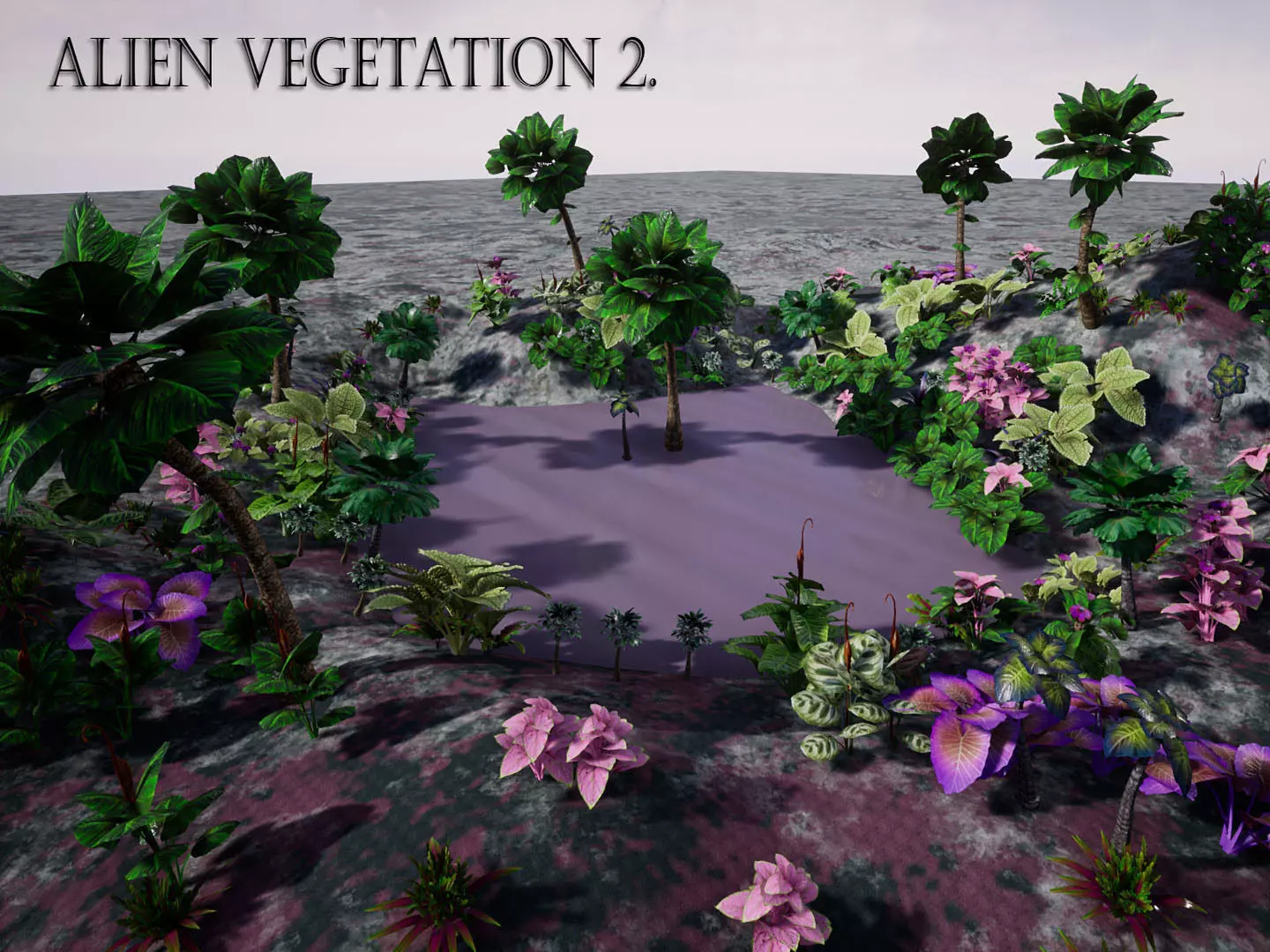 Collection of 24 alien vegetation models; including trees, flowers, bushes and other.All models are animated on wind and ready to paint them on landscape.Color and Normal maps included in shader.Texture Sizes: Textures are 2048*2048 px., 128*512px, 512*1024 pxScaled to Epic skeleton: NoCollision: YesNumber of Meshes: 24Number of Materials and Material Instances: 22​Number of Textures: 36