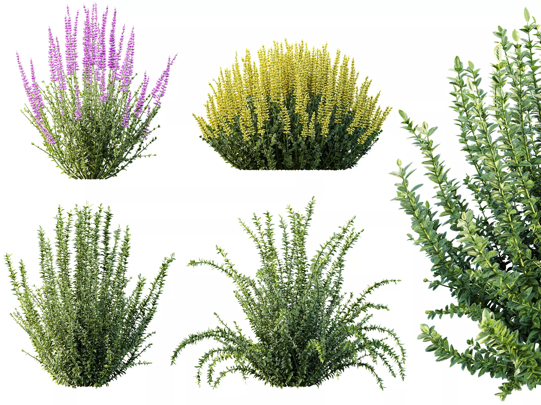A realistic spring bush collection featuring purple and golden heather varieties with lush evergreen foliage — perfect for natural garden rendering and exterior architectural design.