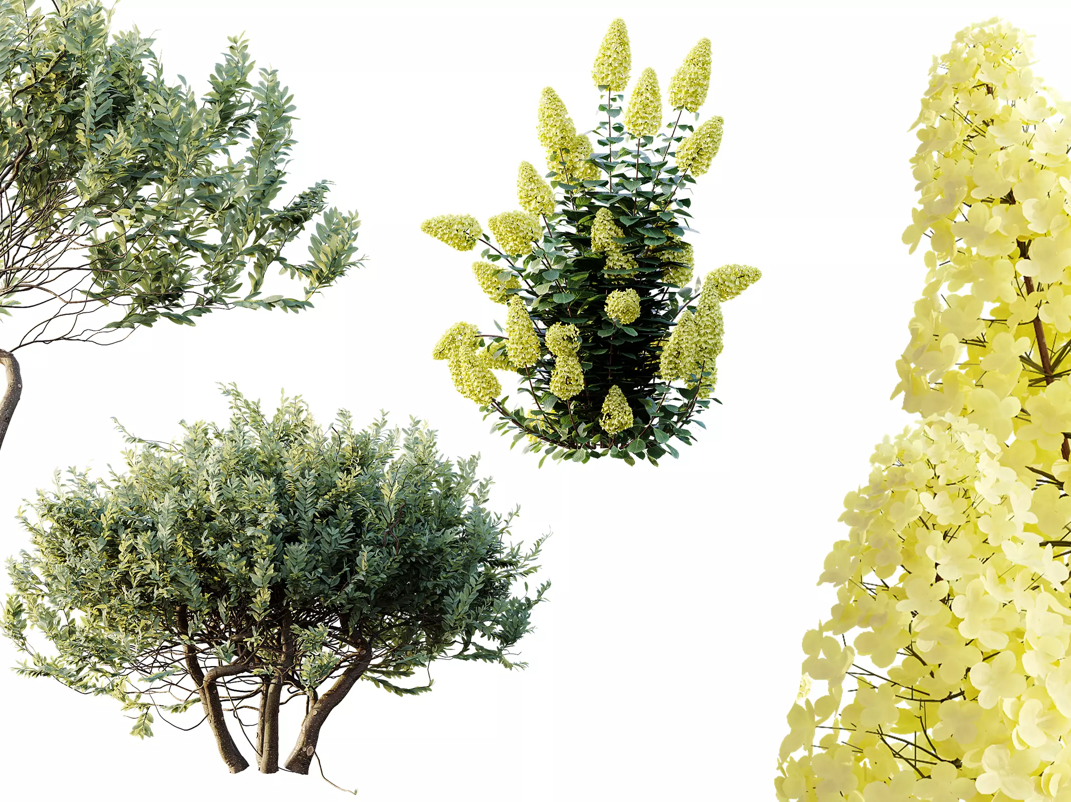 The collection also includes low and medium-height pruned shrubs designed with natural branch structures, ideal for forming elegant borders, clusters, or accent plants in exterior scenes.