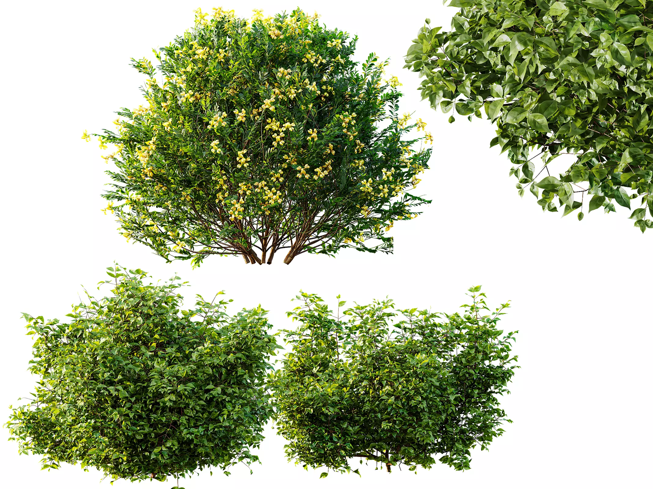 A realistic and elegant collection of Mediterranean shrubs — Coronilla Valentina Glauca with its bright yellow blossoms and Cotinus Coggygria with lush green foliage — perfect for natural garden design and architectural landscaping.