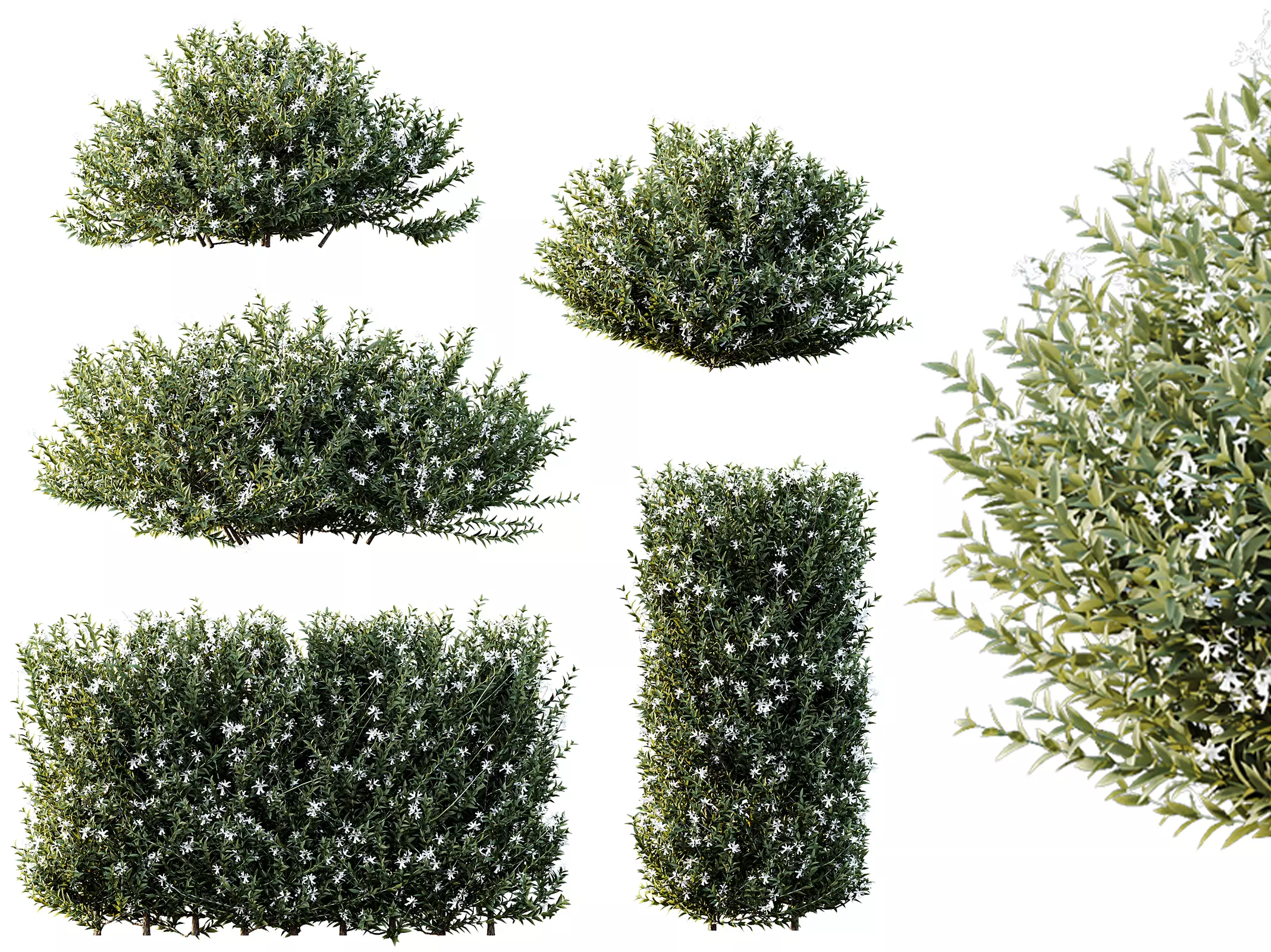 Native to the coastal regions of Australia, Westringia Fruticosa is a hardy evergreen shrub admired for its fine, gray-green foliage and delicate white star-shaped flowers. The model set includes multiple growth forms, from compact hedges to tall columnar shapes, ideal for both decorative borders and garden accents. Its dense texture and subtle variation in leaf tone make it perfect for modern landscape design and coastal vegetation scenes.