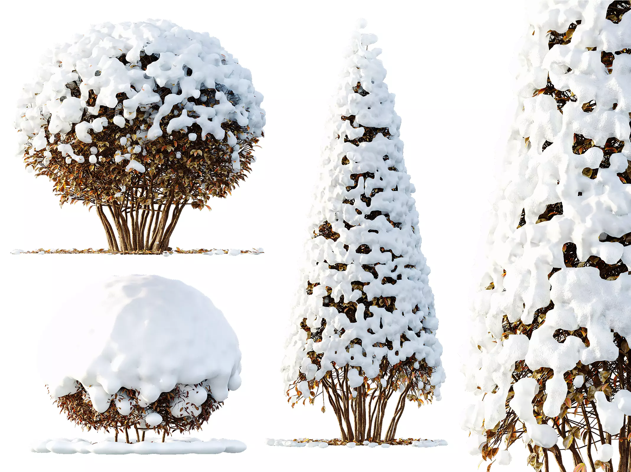 Perfect for snowy gardens, luxury villa exteriors, park environments, residential landscaping, winter architectural visualization, and seasonal game environments. The variation in forms allows flexible composition for foreground focal points, hedge arrangements, or vertical winter accents.