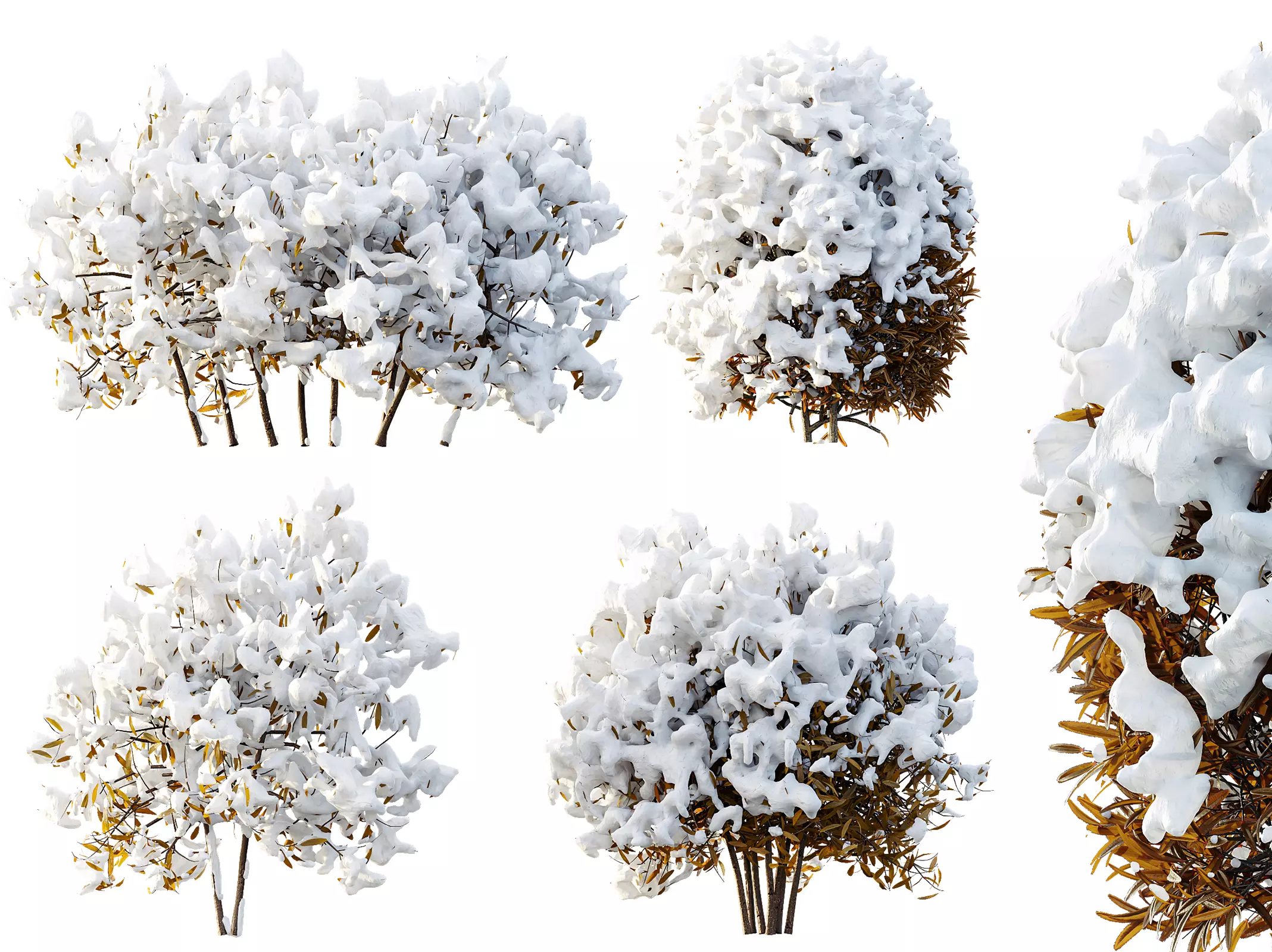 Create realistic winter garden scenes with this detailed WinterPlant Snow collection featuring Snow Arboreum Bush and Snow Phillyrea Angustifolia. This set captures the natural accumulation of fresh snow resting on dense shrubs and structured foliage, producing soft rounded silhouettes ideal for cold-season landscapes and architectural exterior visualization.