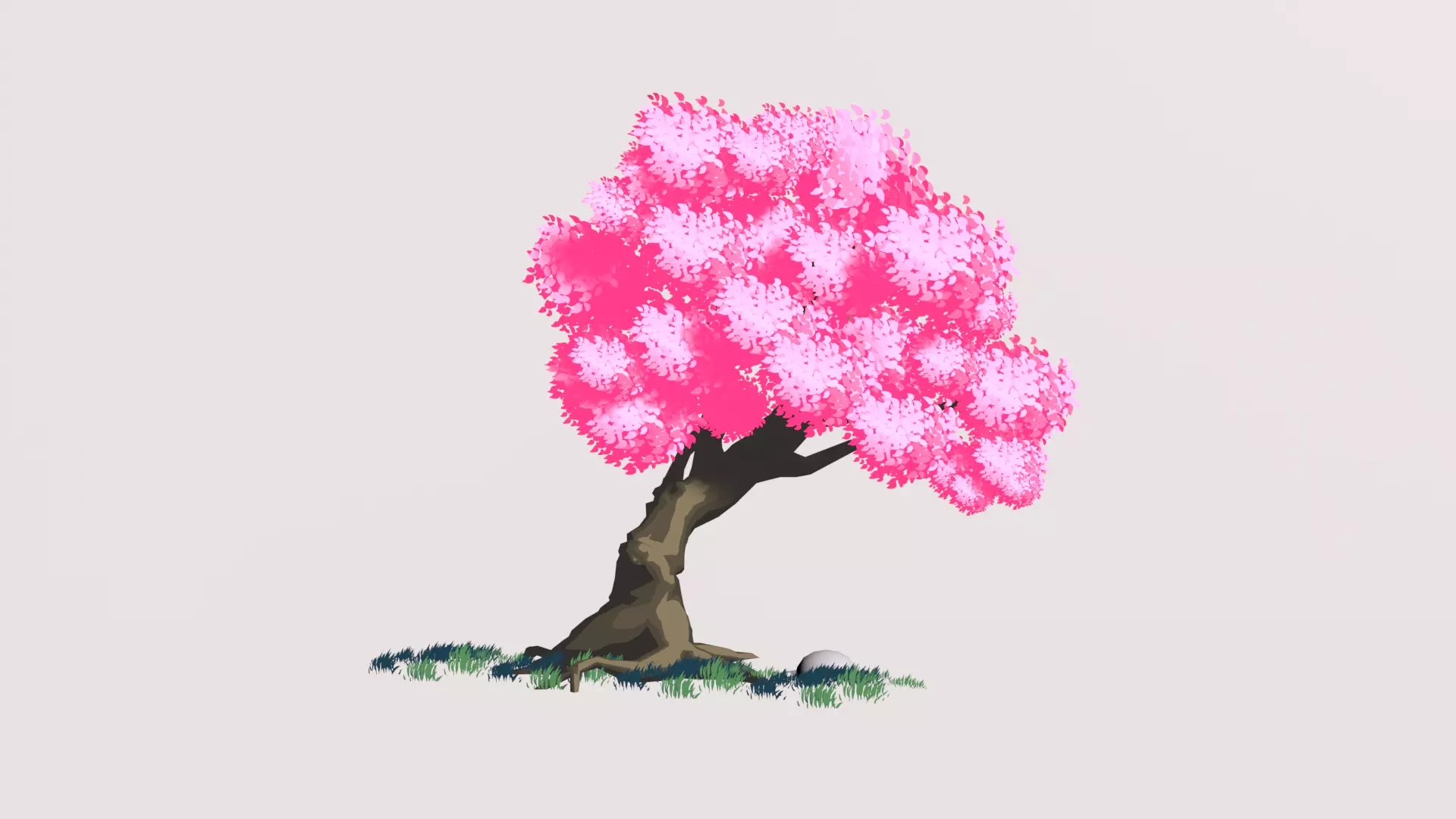 This is a minimalist 3D model of a Japanese cherry blossom tree, designed in Blender for low-end PCs. The tree features a simple, stylized structure with a slender brown trunk and a rounded canopy of vibrant pink blossoms, capturing the essence of a blooming sakura. The foliage is created using low-poly geometry and a dotted texture to simulate clusters of flowers, keeping the polygon count low for smooth performance. The base includes a small patch of green grass, adding a subtle ground detail without taxing system resources. Ideal for lightweight games or animations, this model balances visual charm with optimized performance.