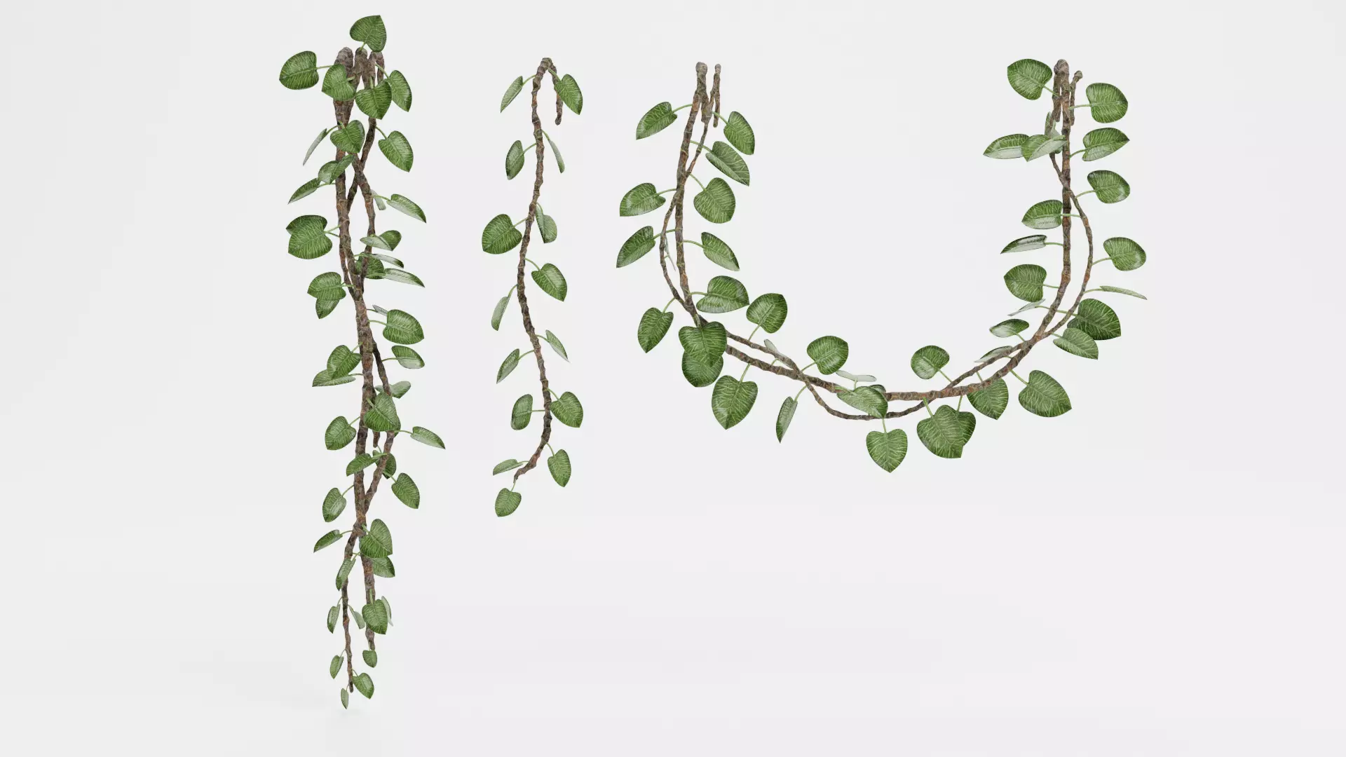 Realistic liana plant collection featuring three distinct hanging greenery arrangements, designed to offer flexible compositional options. The collection includes a single strand, a fuller clustered form, and a wide U-shaped arrangement, each built with naturally twisting stems and leaves that retain subtle structure and visible veining. The variety in flow and density allows the assets to be used for filling vertical spaces, adding layered depth, or framing openings in interiors, exterior walls, and environmental setups. All variants maintain consistent material quality and visual cohesion, providing ready-to-integrate greenery for versatile scene composition.