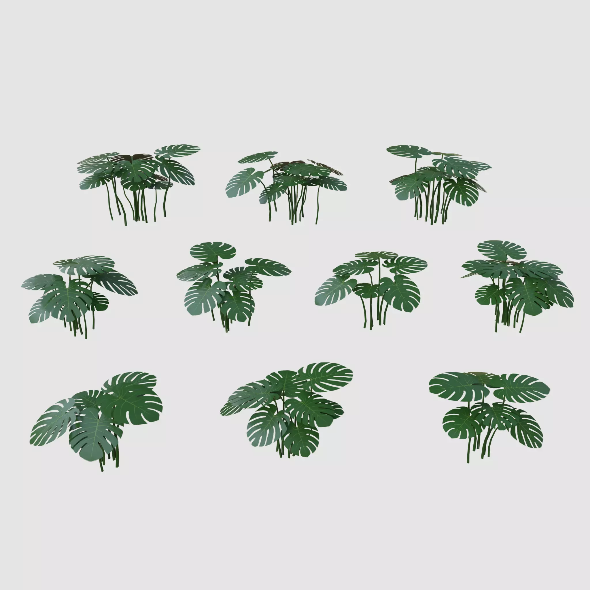 • This set consists of 10 monstera bushes. Each bush has three levels of detail (LOD).