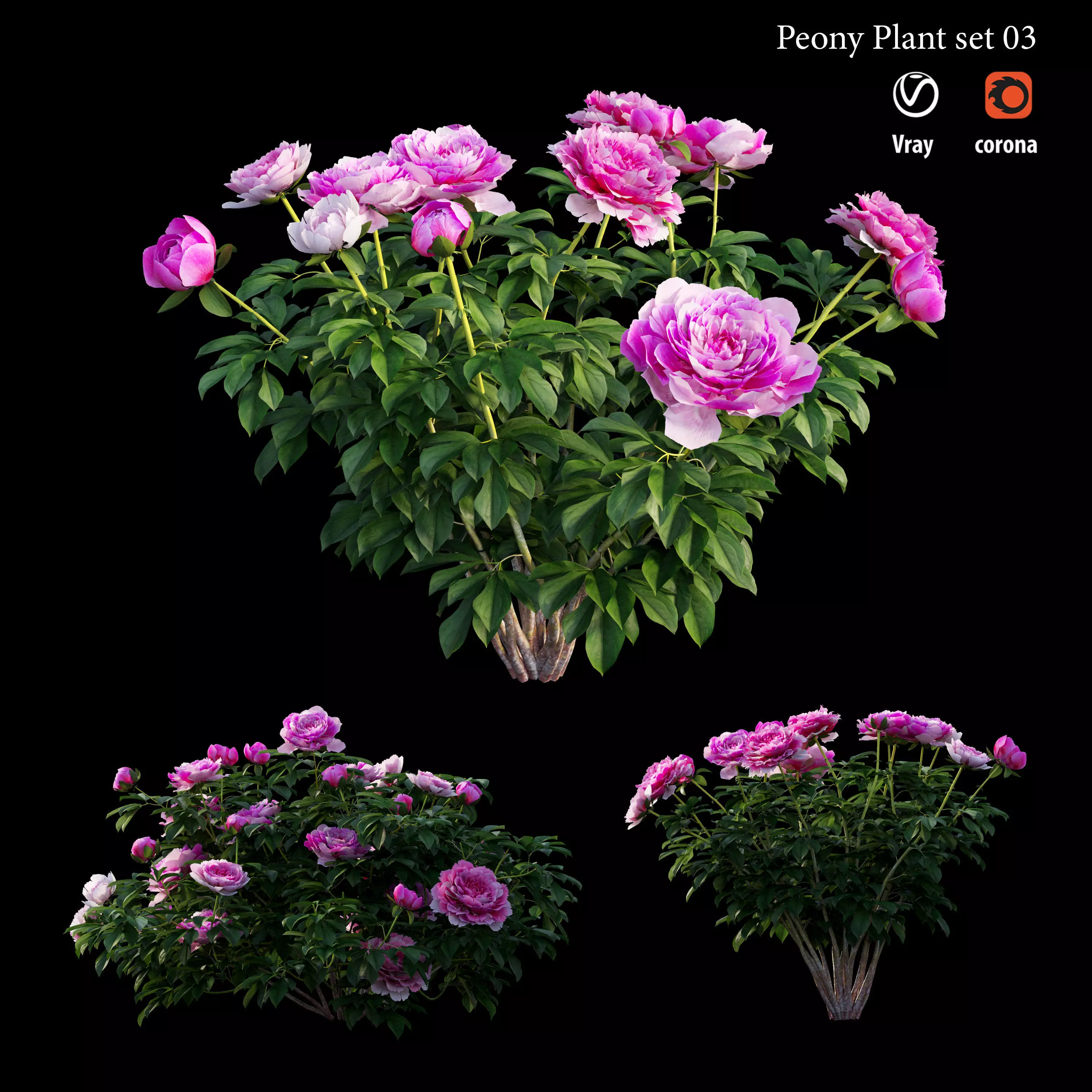 Peony plant set 03 use software : 3dsmax ( corona /vray/fstorm/arnold ) - sketchup 2008 - Cinema 4D(vray/corona/default) - Blender -Maya - rhino - Modo - vrmesh( vray for revit /sketchup