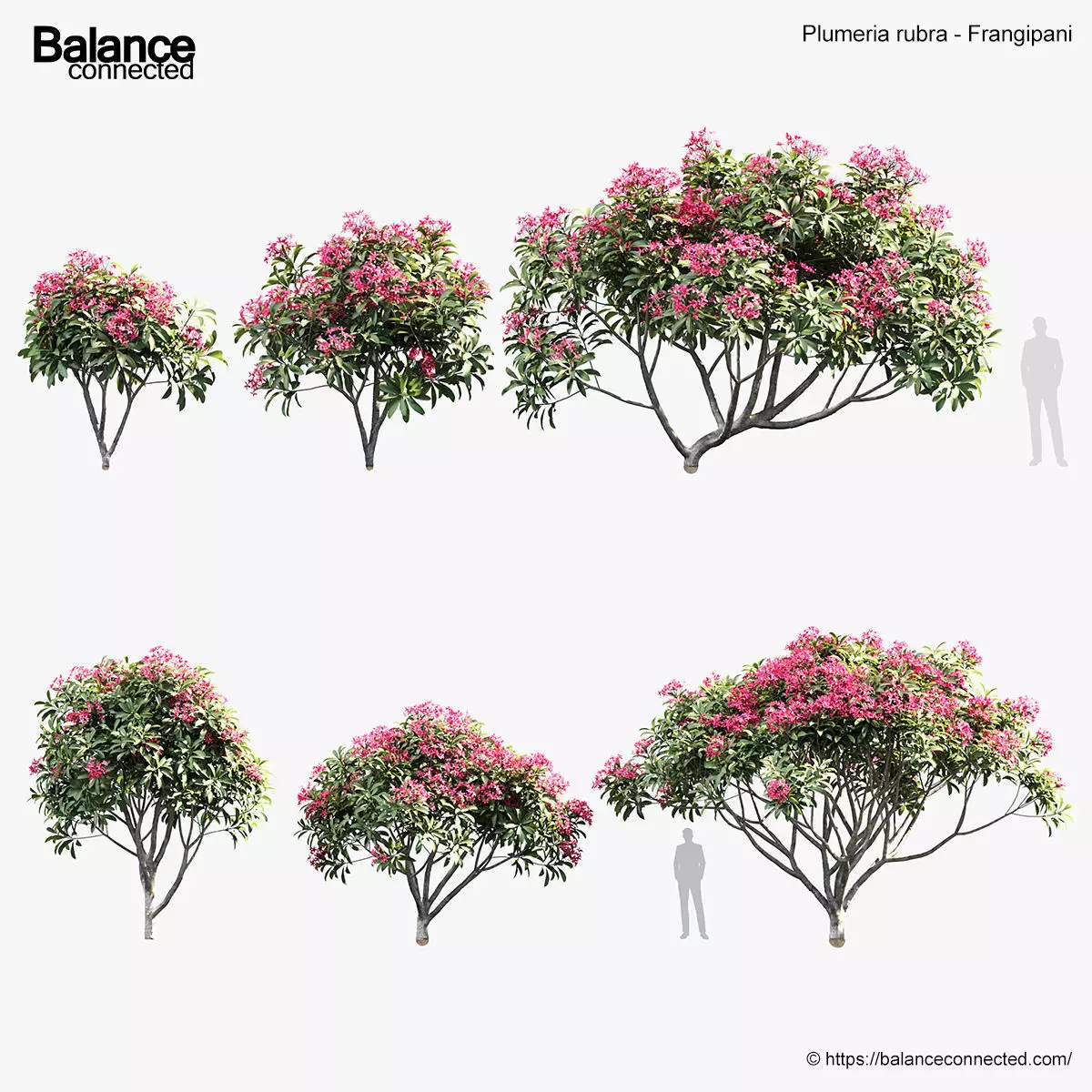 This product Plumeria rubra - Frangipani 6 unique 3D model variations with different heights, ages and forms of the species available for your production needs. We are sure our “ready to import and render” products will help you with production efficiencies and effectively.