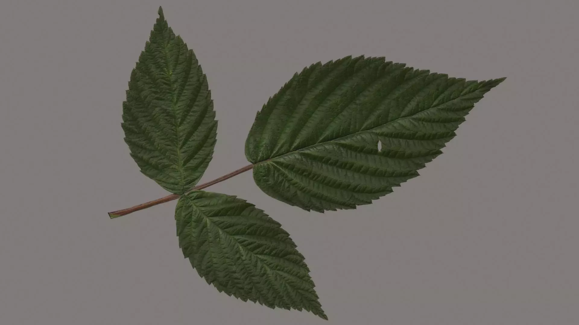 Photoreal raspberries leaf PBR material. image size: 1885х16897 textures: Diffuse, Normal, Glossiness, Displacement, Transucency, Alpha, Bump 1 polygon.