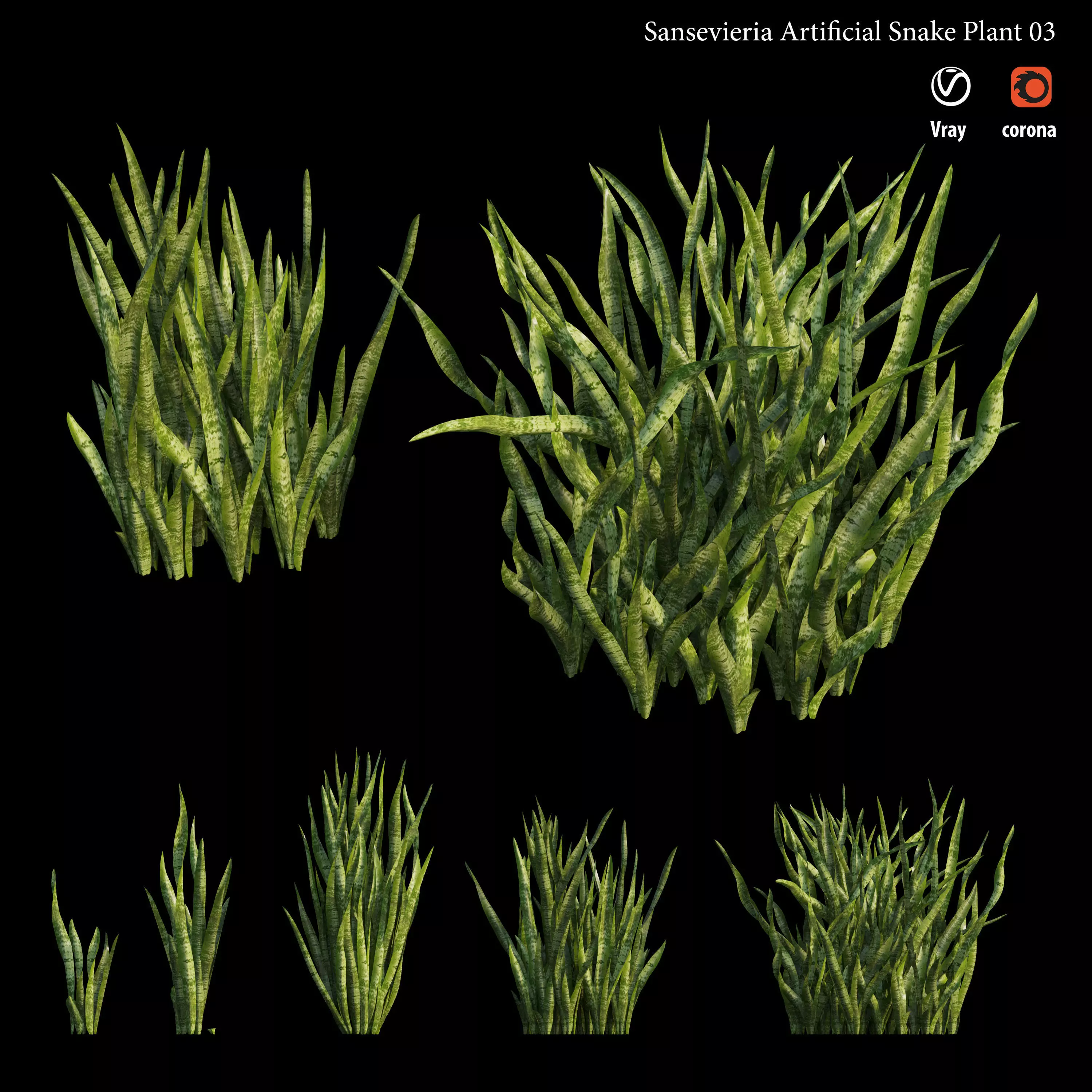 Sansevieria Artificial Snake Plant 03 use software : 3dsmax ( corona /vray/fstorm/arnold ) - sketchup 2008 - Cinema 4D(vray/corona/default) - Blender -Maya - rhino - Modo - vrmesh( vray for revit /sketchup).Supports motion simulation for 3dsmax/BlenderWith its long, sharp green leaves in various sizes, resting in its own slate finished planter, this Sansevieria Artificial Snake Plant in Planter will instantly bring the look of the arid desert into your home. It can be used to decorate any tight or wasted spaces in your home and office. Settle this ornament near your fireplace mantel to accent your decorative pieces, like vases or figurines, for a classic arrangement. -Features Can be used to decorate tight spaces Variegated green leaves with yellow outline Carefully crafted for a lifelike appearance Settled in a slate finished planter Recommended for indoor use or a covered, protected outdoor location Silk floral arrangements are manufactured using synthetic materials and are well designed and constructed to be life-like in appearance