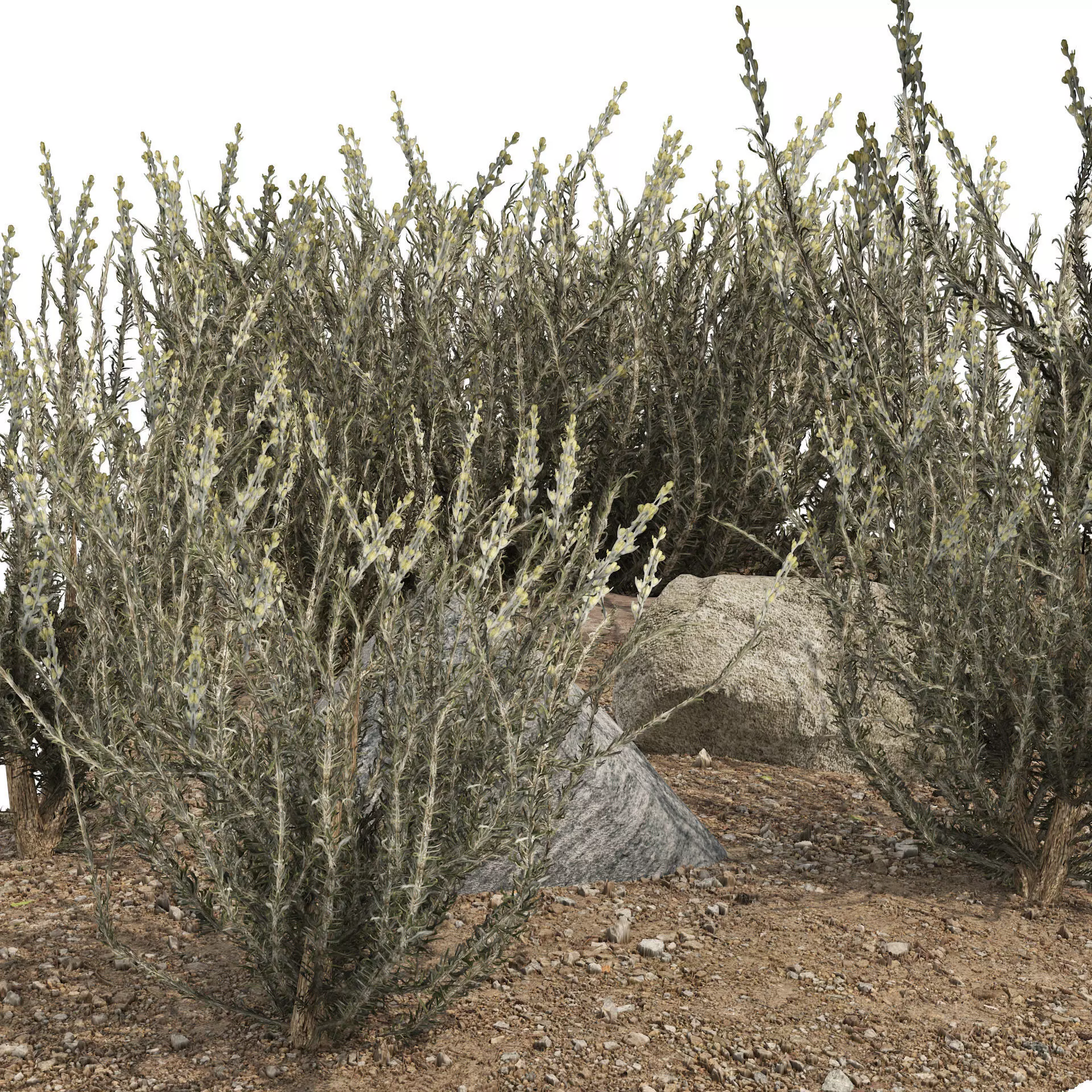 Highly detailed and optimized 3d model of Silver Sagebrush bushes collection on a dirt hill and rock.