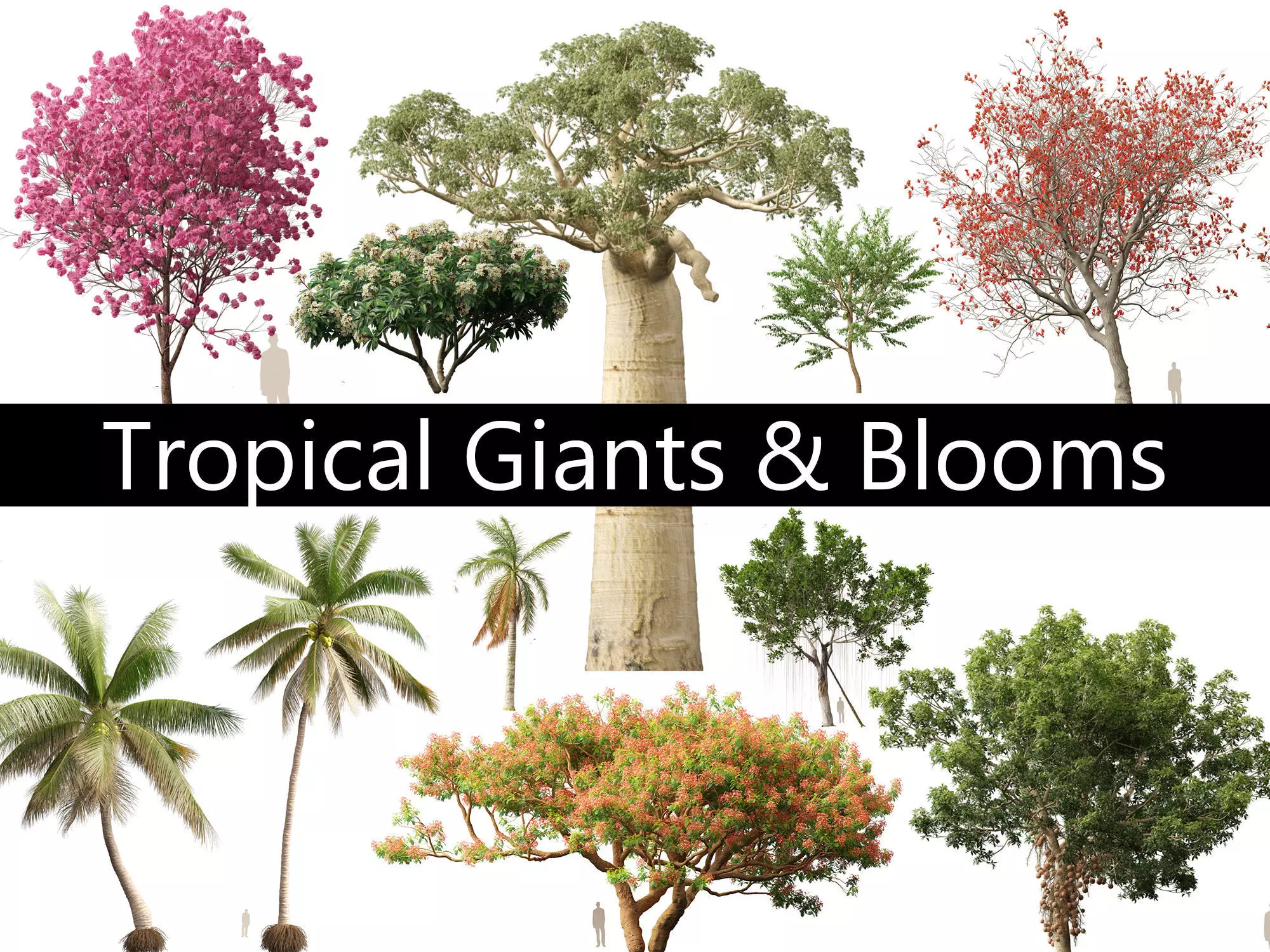 Software:Unreal Engine 5,3Ds Max (Corona,V-Ray),FBX,Blender(Cycles,Eevee),Twinmotiom(.tmi),SkechUp(thea,vray,enscape)16 Species of Tropical Giants & Blooms plants,114 Models Included