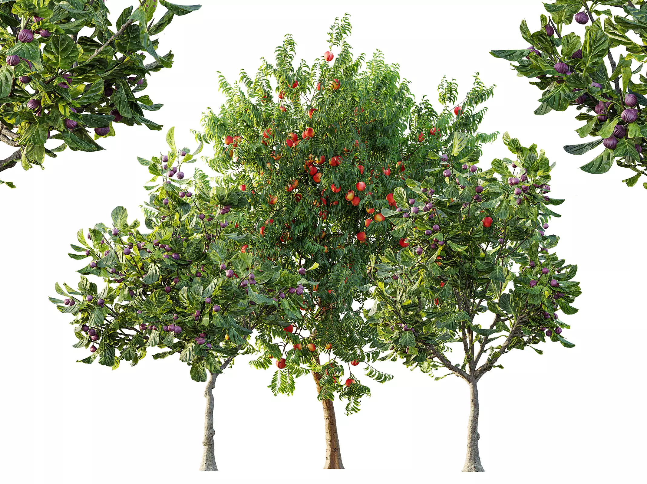 This duo perfectly combines contrasting leaf textures and fruit forms, creating a harmonious yet dynamic ensemble ideal for exterior visualizations, villa courtyards, or romantic orchard scenes.
