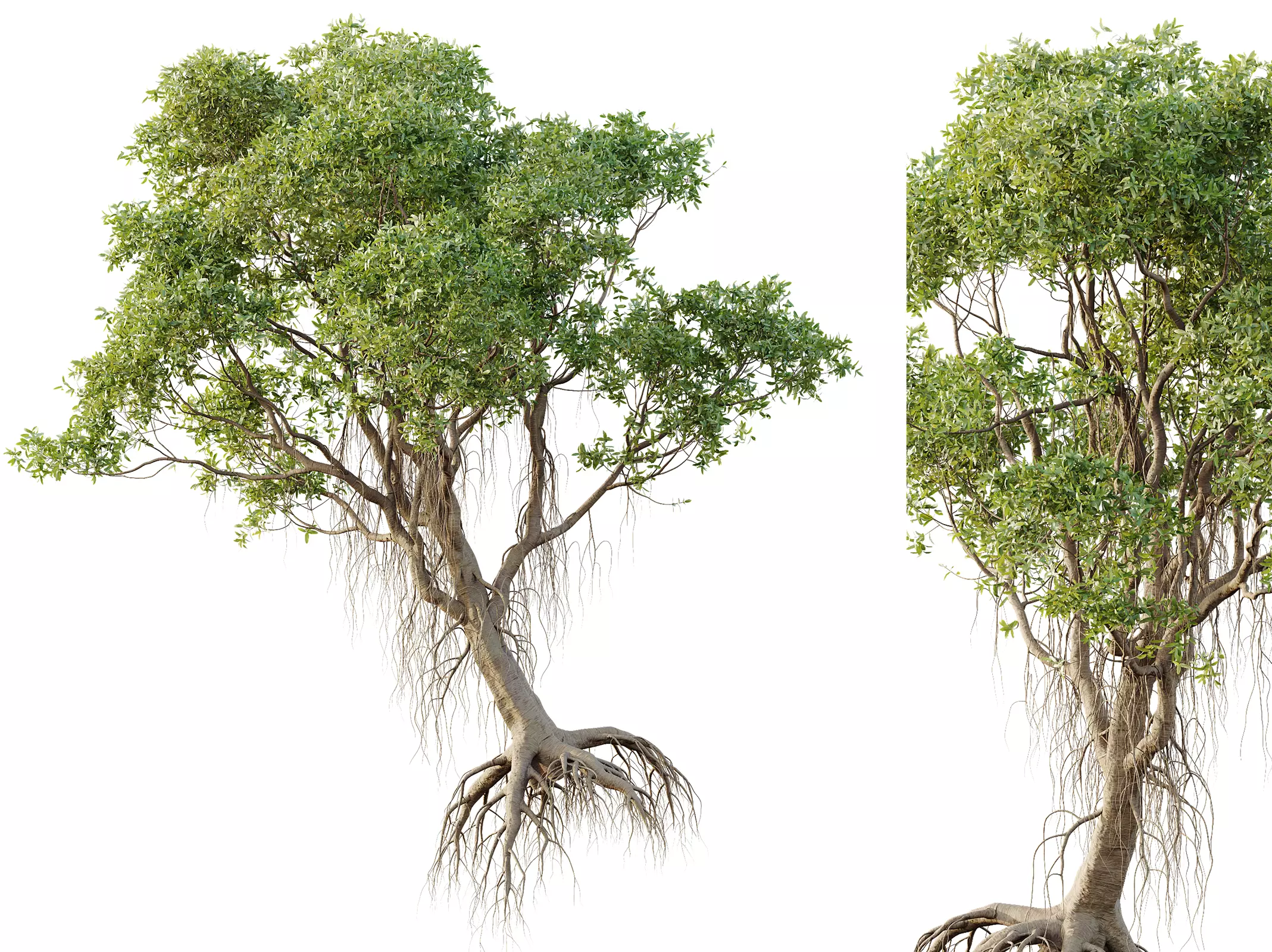 This highly detailed 3D model showcases the striking form of Avicennia marina, the Grey Mangrove—a species renowned for its resilience and sculptural presence in coastal and tidal environments. The model features a gracefully arched trunk with intricate aerial roots that descend elegantly, merging seamlessly with exposed root structures at the base. This natural architecture reflects the tree’s ecological adaptation to saline wetlands and tidal shorelines.