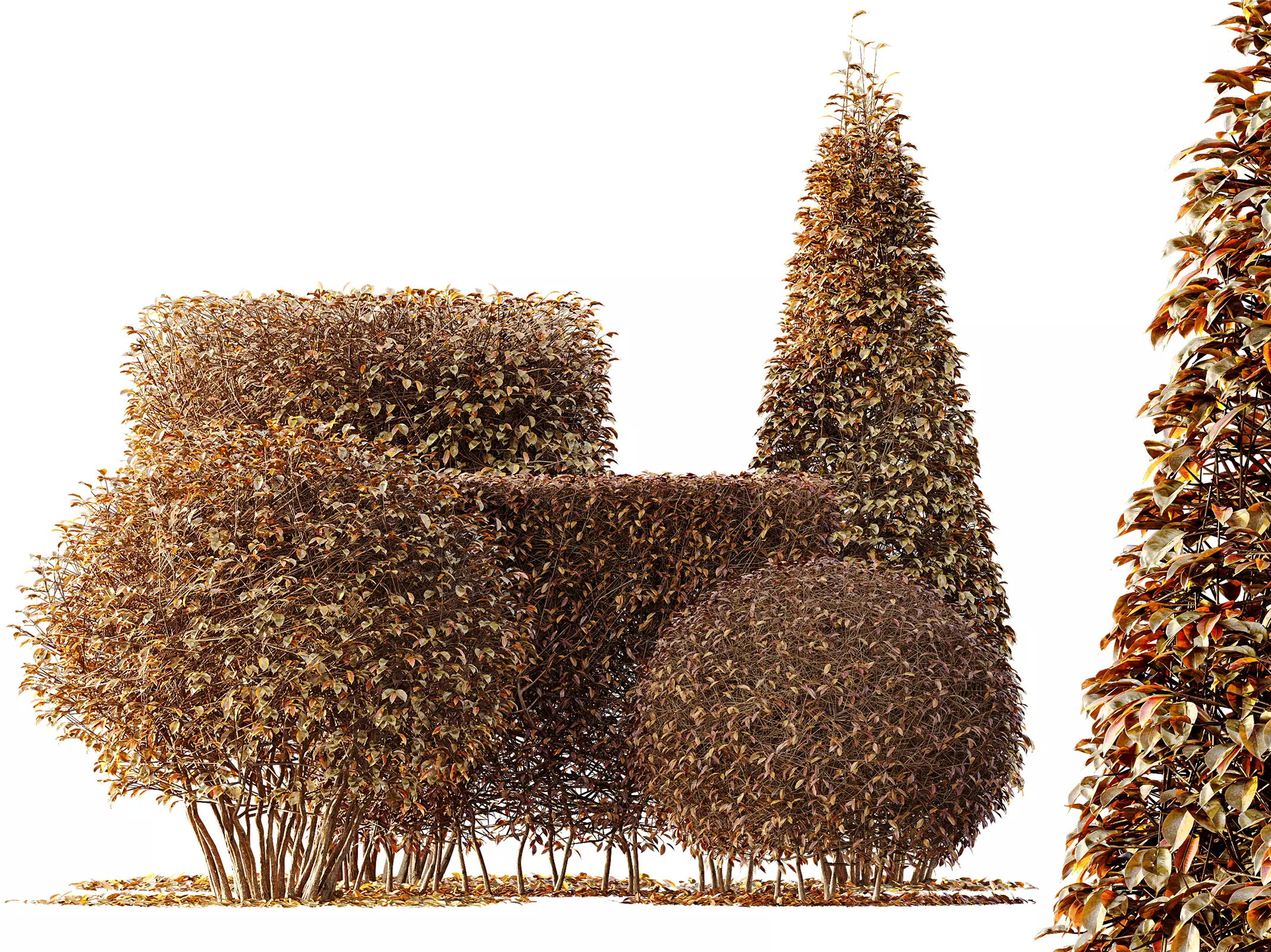 Enhance your fall and winter landscape scenes with this high-quality Yaupon Holly topiary collection featuring box, spherical, and cone shapes. This set includes carefully trimmed hedge forms with dense seasonal foliage, making it ideal for gardens, courtyards, villas, parks, commercial exteriors, and professional architectural visualizations requiring structured ornamental greenery.