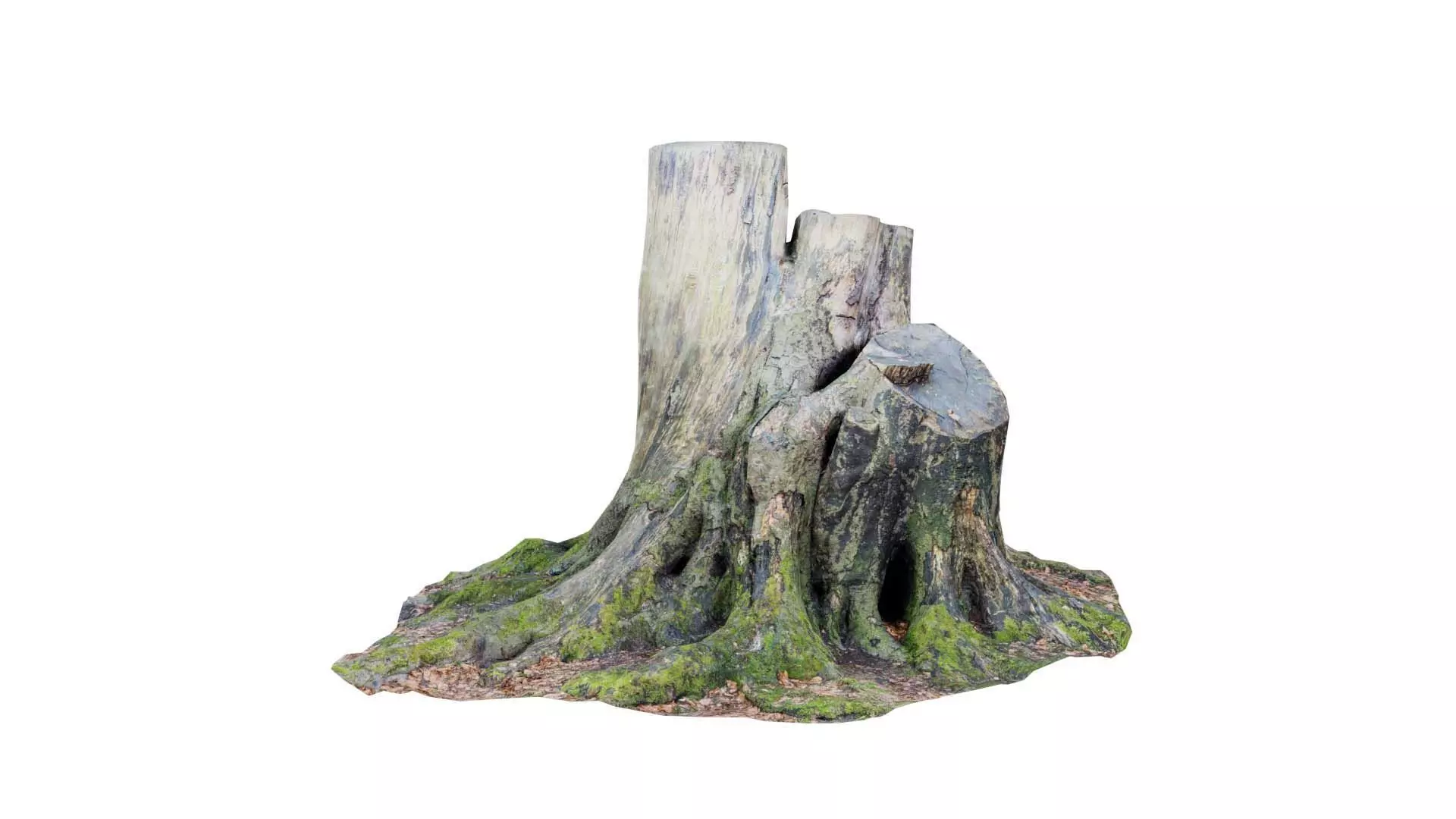 3D scanned model featuring a tree stump with moss on it. This model, large triple sawed off tree stumps, has been created using photogrammetry from a real world object.The raw scan data has been cleaned, retopologized and UV-unwrapped using Zbrush. The result is a low poly mesh with baked maps. The .obj and .mtl are configured so that maps will load automatically in the shader (tested in Blender). In addition, a Blender scene is provided with the model and shader already set up for rendering and export. Detailed information below: