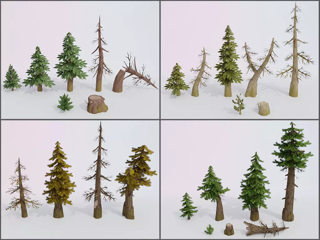 Low poly set of hand-painted spruces, suitable for creating environment and atmosphere in your game or scene. It includes 25 objects: models of green growing trees, fallen tree, various tree stumps, dry trees, small coniferous bushes, etc.