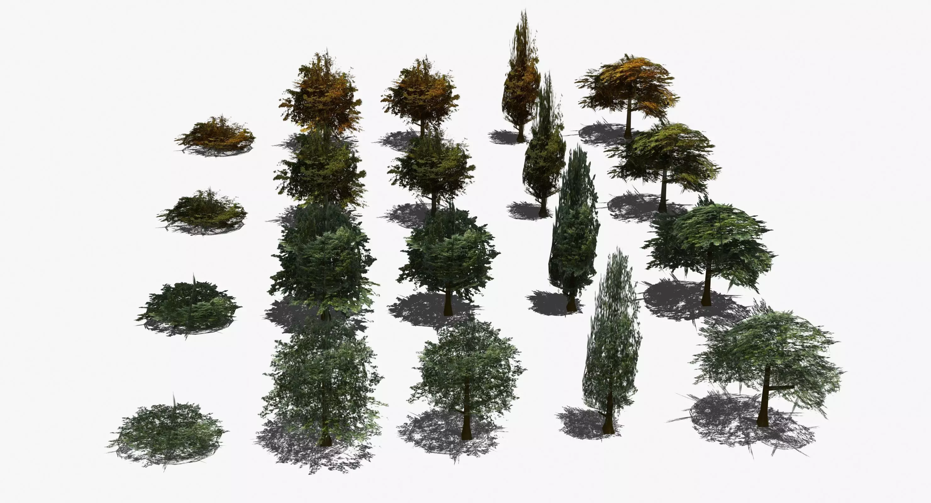 Collection of real-time low poly trees. Four PNG textures used, with alpha channel linked to opacity. One material and texture per tree. Each tree or bush is approximately 90 polys. Great multipurpose 3D model (ideal for offline rendering or real time uses such as games or simulation).