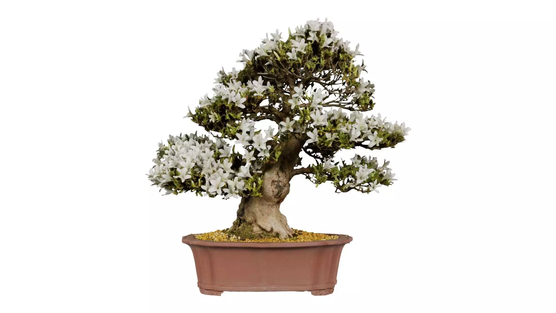 This model, satsuki azalea large white rhododendron indicum bonsai tree, has been created using photogrammetry from a real world object. It is featuring bonsai tree in a brown pot with white flowers.The 3D Model is part of the Polygonal Miniatures Remastered collection, which has been optimized with better shaders, correct scaling (meters) and centered position.We use multi camera capturing in the 3D scanning process. The scan data is cleaned and processed in Zbrush and Photoshop. In the end, the low poly product contains unwrapped UV's, textures and normals maps. Detailed specifications can be found below: