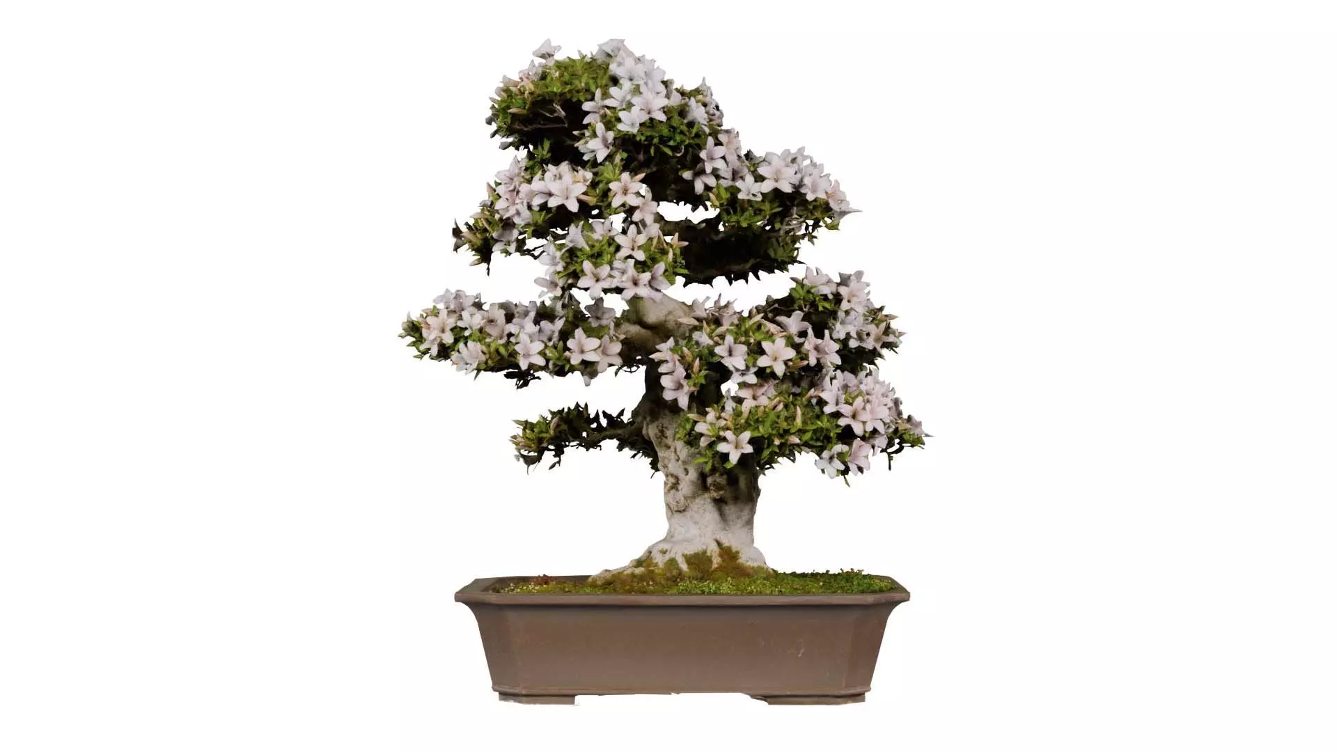 This model, satsuki azalea white rhododendron indicum bonsai tree, has been created using photogrammetry from a real world object. It is featuring bonsai tree with flowers.The 3D Model is part of the Polygonal Miniatures Remastered collection, which has been optimized with better shaders, correct scaling (meters) and centered position.We use multi camera capturing in the 3D scanning process. The scan data is cleaned and processed in Zbrush and Photoshop. In the end, the low poly product contains unwrapped UV's, textures and normals maps. Detailed specifications can be found below: