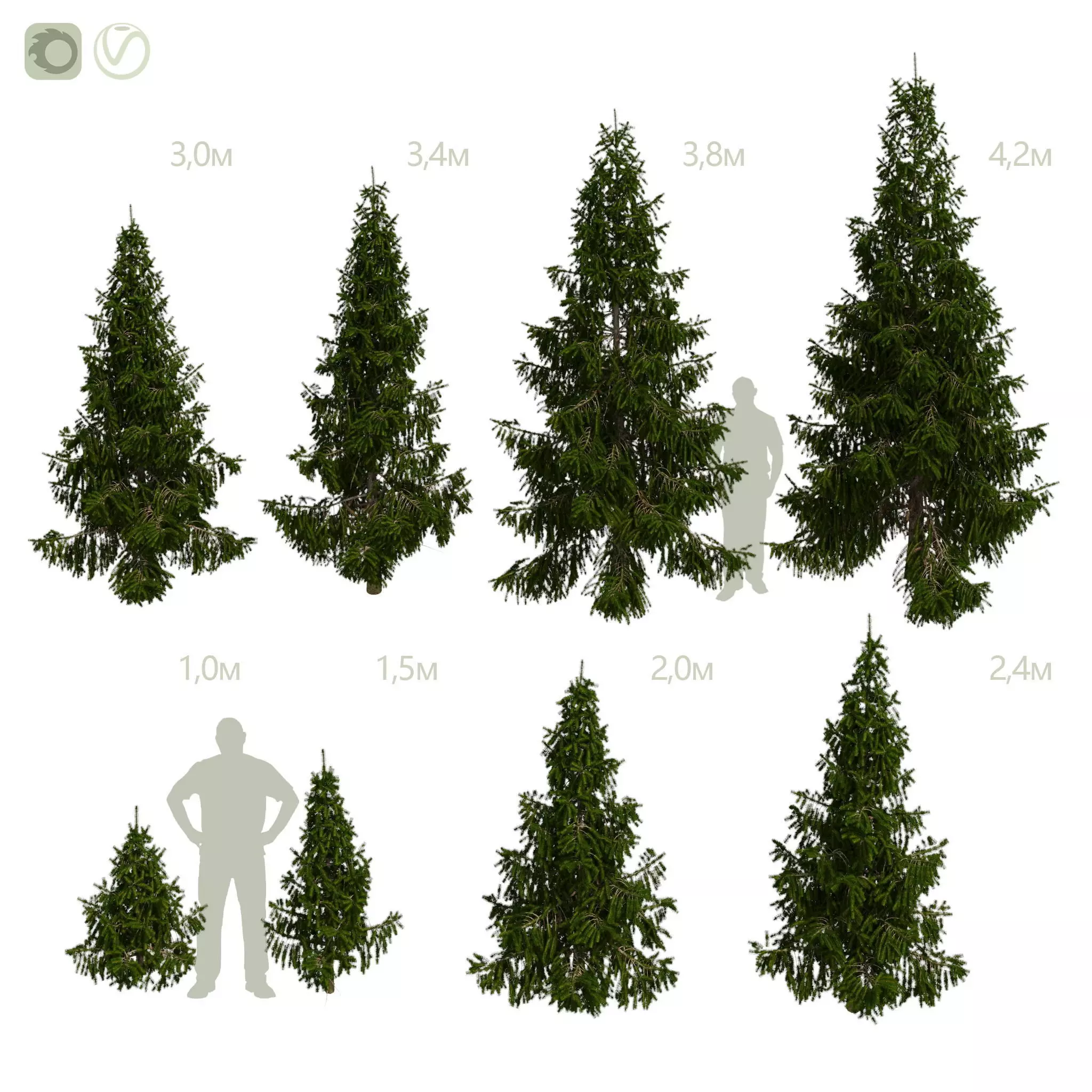 SpruceThere are eight spruce options in the set.Approximate dimensions:height 4200mm, crown diameter 2200mmheight 3800mm, crown diameter 2000mmheight 3400mm, crown diameter 1600mmheight 3000mm, crown diameter 1600mmheight 2400mm, crown diameter 1200mmheight 2000mm, crown diameter 1200mmheight 1500mm, crown diameter 900mmheight 1000mm, crown diameter 800mmTexture options are placed directly in the scene on the cubes, you can take them using the eyedropper tool of the material editor.All materials and objects in the scene have logical names in English, so you can easily figure out which material to apply to which object.The model is ready for rendering in Vray and Corona.