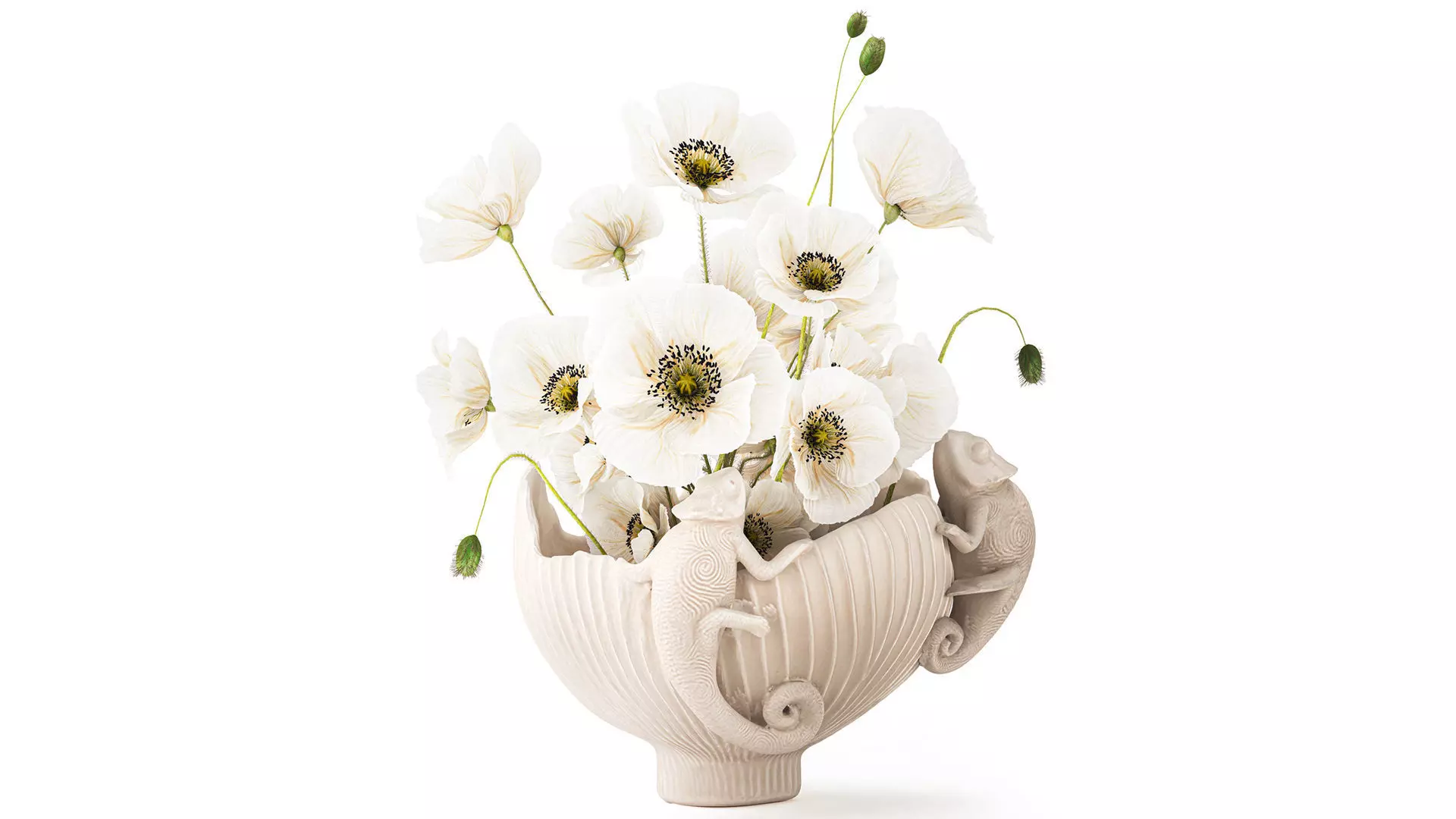 A beautiful bouquet of wildflowers, white poppies, in a modern vase with a chameleon motif. Set 773.Summer BouquetWildflower BouquetVasePapaver nudicaule - Poppy, Icelandic poppyMinimalist, monochrome, bouquet for a cafe table, round glass vase, beige, cream, delicate.Decorative chameleon figurine on a vase, figurine