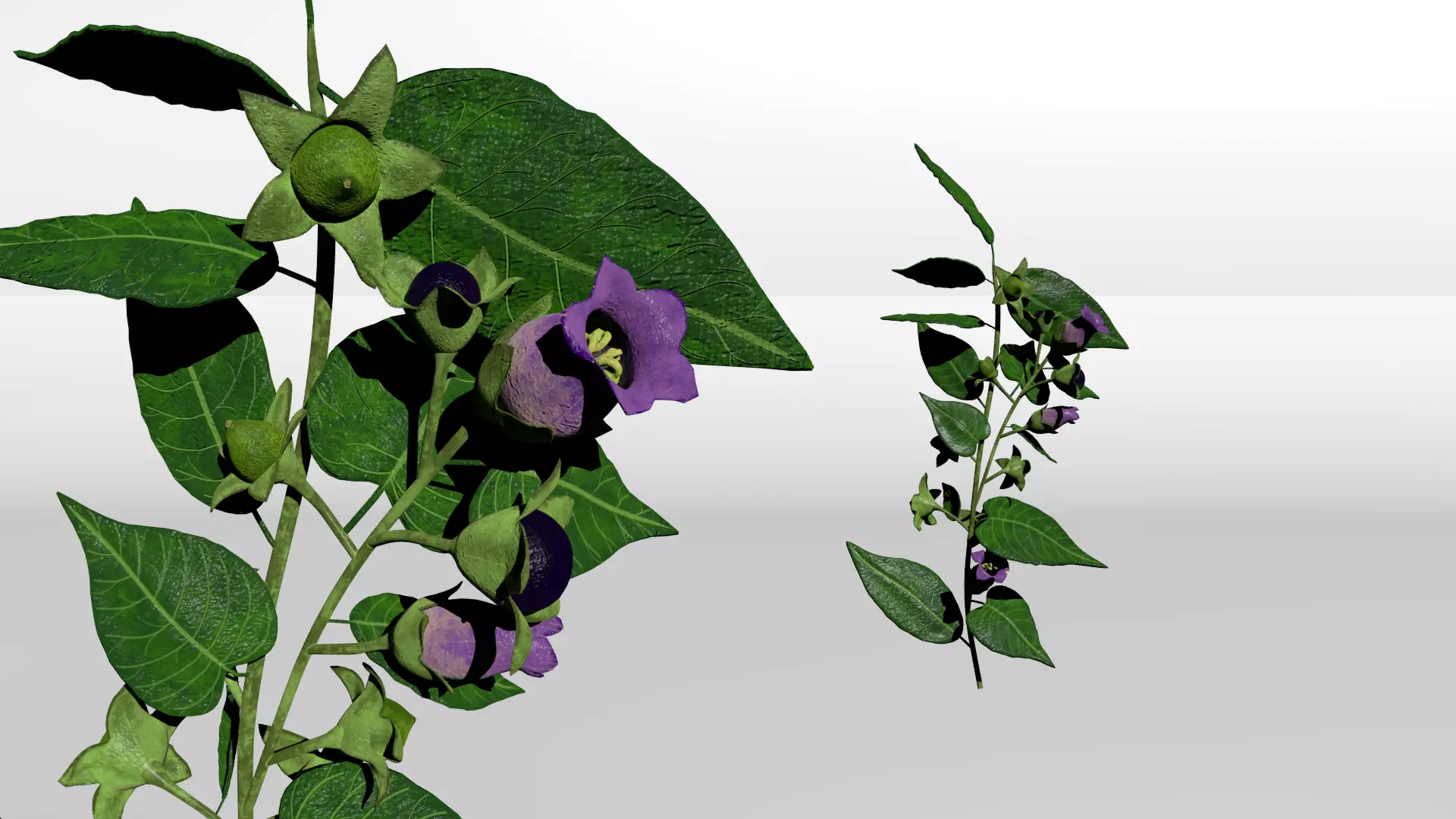 A detailed, stylized belladonna arrangement; can be used to decorate an indoor or outdoor scene. Textures included but not applied to asset. I can export further file formats upon request. (Images rendered using Mental Ray).