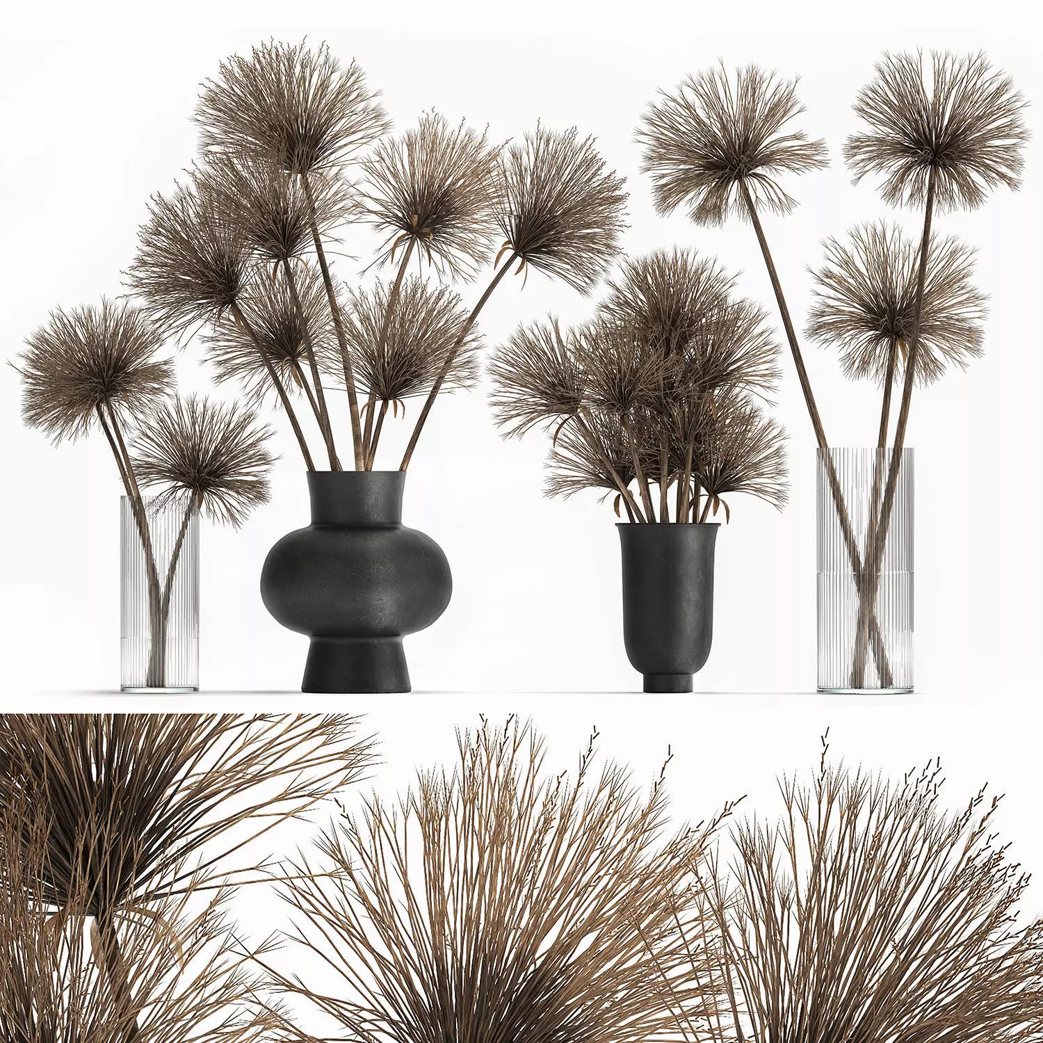Decorative bouquet of dried flowers in vases from monpote for decor and interior design.Bouquet of dried flowers TsiperusVase - MENU CYCLADES VASELarge: 260mm H x 140mm D dry, stabilized, paintedStems, dried pods, natural decorCyperus papyrusCyperus