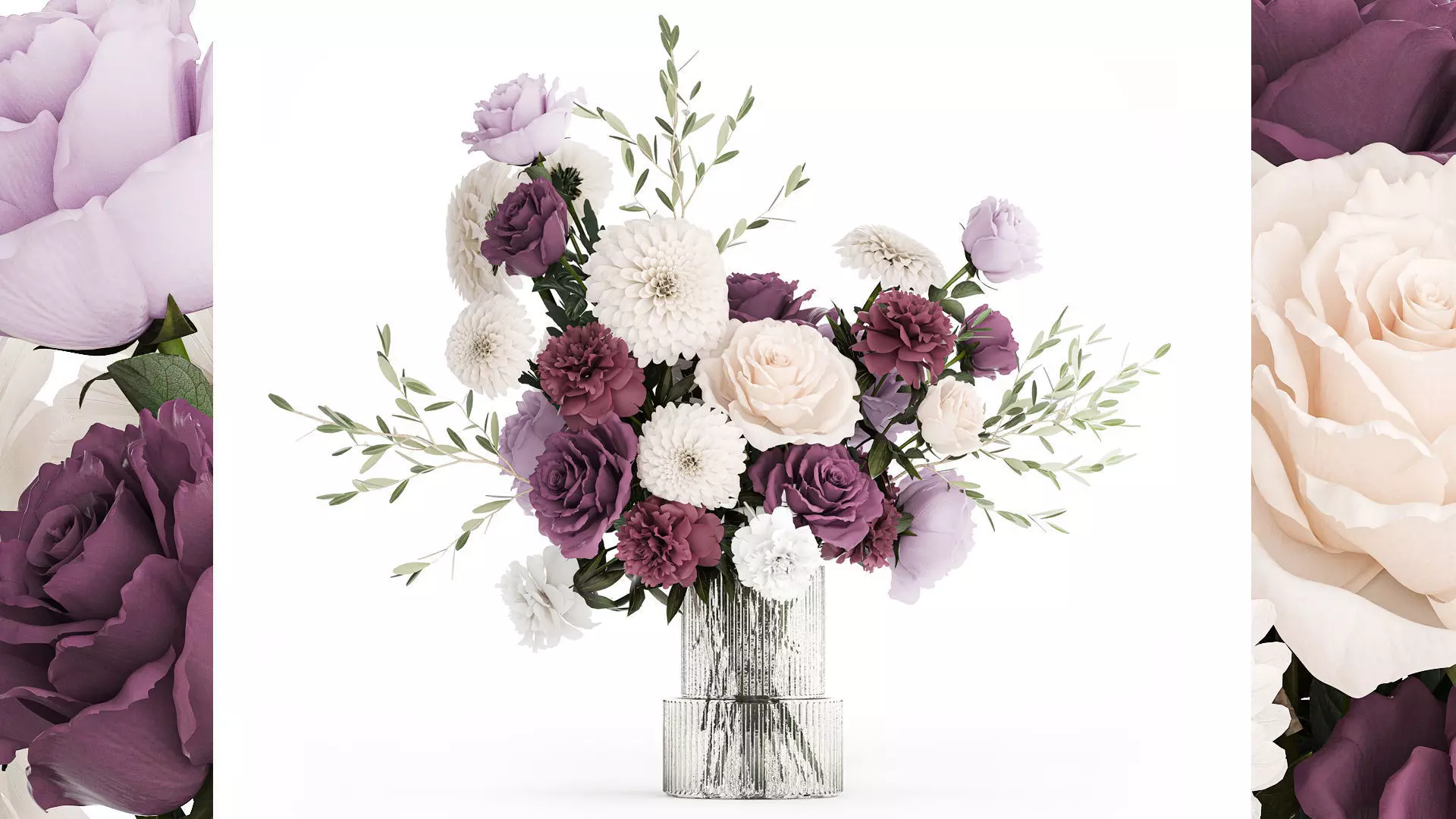 Beautiful small bouquet of purple and white flowers in a modern glass vase, chrysanthemum, rose, peonies. Set 395.Decorative Bouquet of white flowers in a glass vase for decoration and interior.Bouquet of branches and flowersbouquet of green leaves and branchesvase with branches, branches in a vaseSpring bouquetPaeonia, peony - PeoniesRose - pink and white rosesOlive branch in a vasedahlia - Dahliaschrysanthemum, golden-daisy - Chrysanthemumvases - 2.hm, H&M HOME