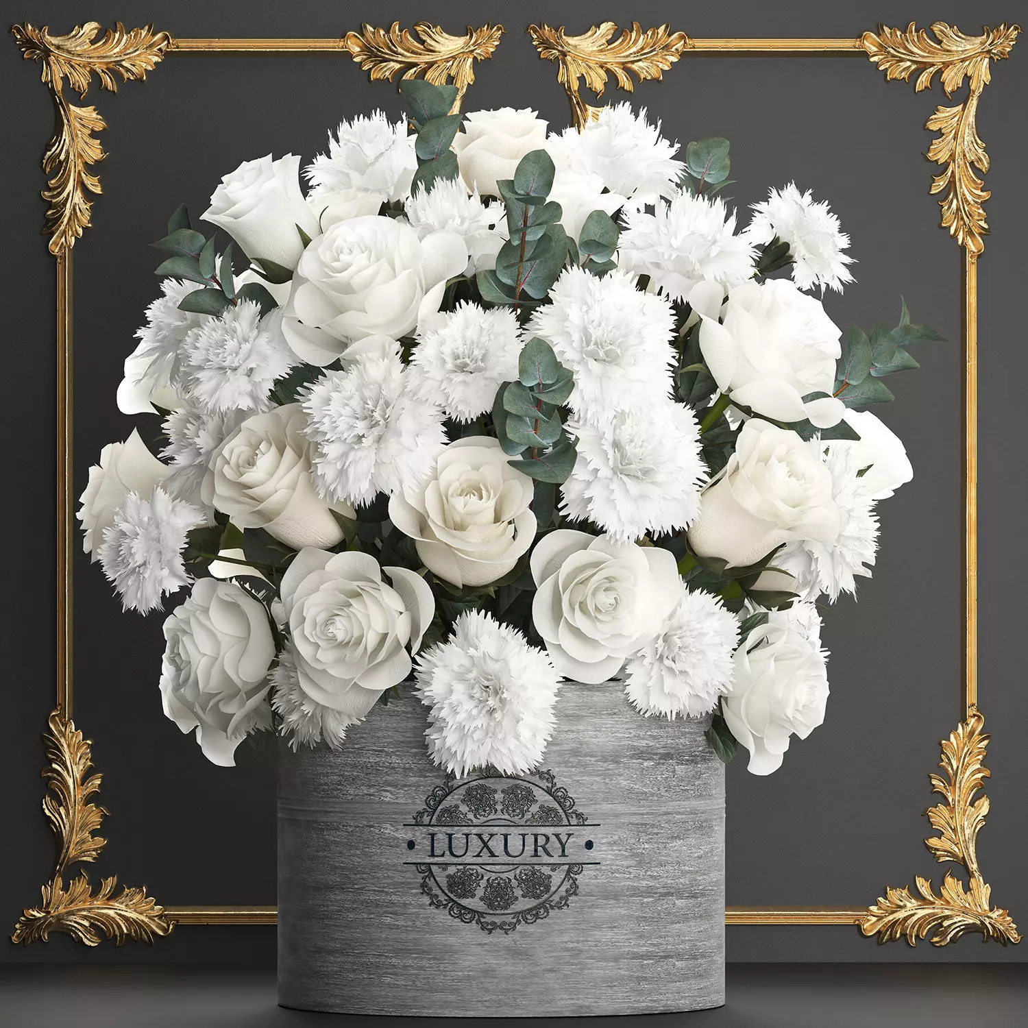 Bouquet of flowers in a gift box. luxurybouquet of white flowersgeneral decorSpring flower bouquetStucco frame, stucco moldingStucco frame, stucco moldingSpring bouquetWhite RoseDianthus caryophyllusCloveCarnation