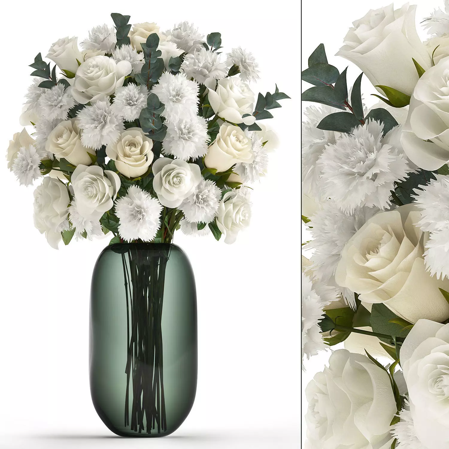 Decorative Bouquet of white flowers in a vase for decor and interior design. Bouquet of white flowers.White RoseDianthus caryophyllus - CarnationPaeonia - White PeoniesEucalyptus - Eucalyptus