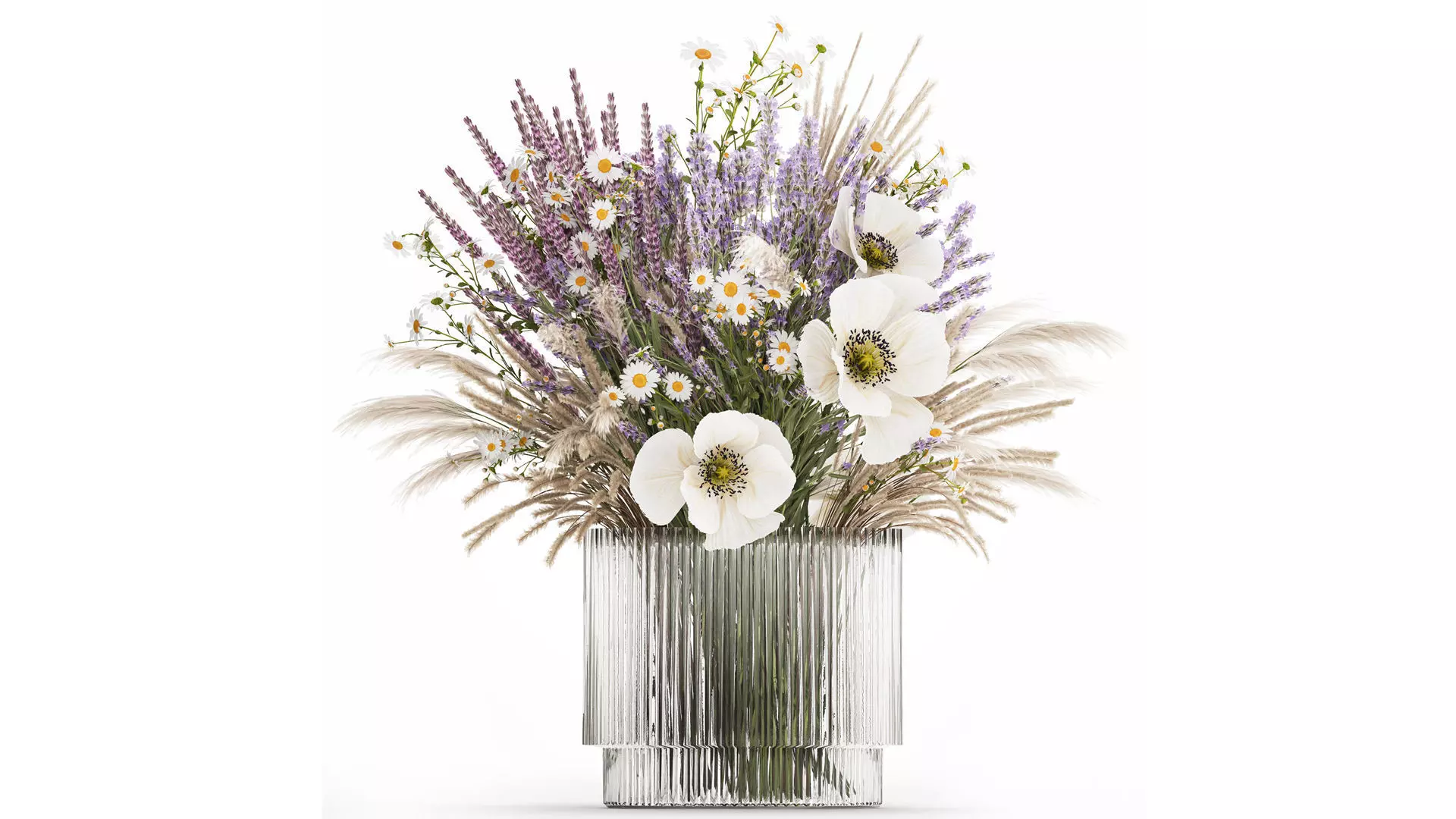 Beautiful bouquet of wild flowers in a glass vase with lavender, chamomile, fan grass, pampas, poppy. Set 483.Decorative Bouquet of wild flowers in a glass vase for decor and interior.Bouquet of wild flowersvaseLavender - Lavandula, lavenderCatnip - NepetaSage - Salvia nemorosaFan grass, reed grass - CalamagrostisCortaderia, pampas, pampas grassPapaver nudicaule, poppy - Poppy, Icelandic poppyBouquet of daisiesMatricaria, chamomile - Chamomile, Information, Chamomile, Tanacetum, TansyMayweed, Daisy, daisiesvase - 2.hm, H&M HOMEdried flowers