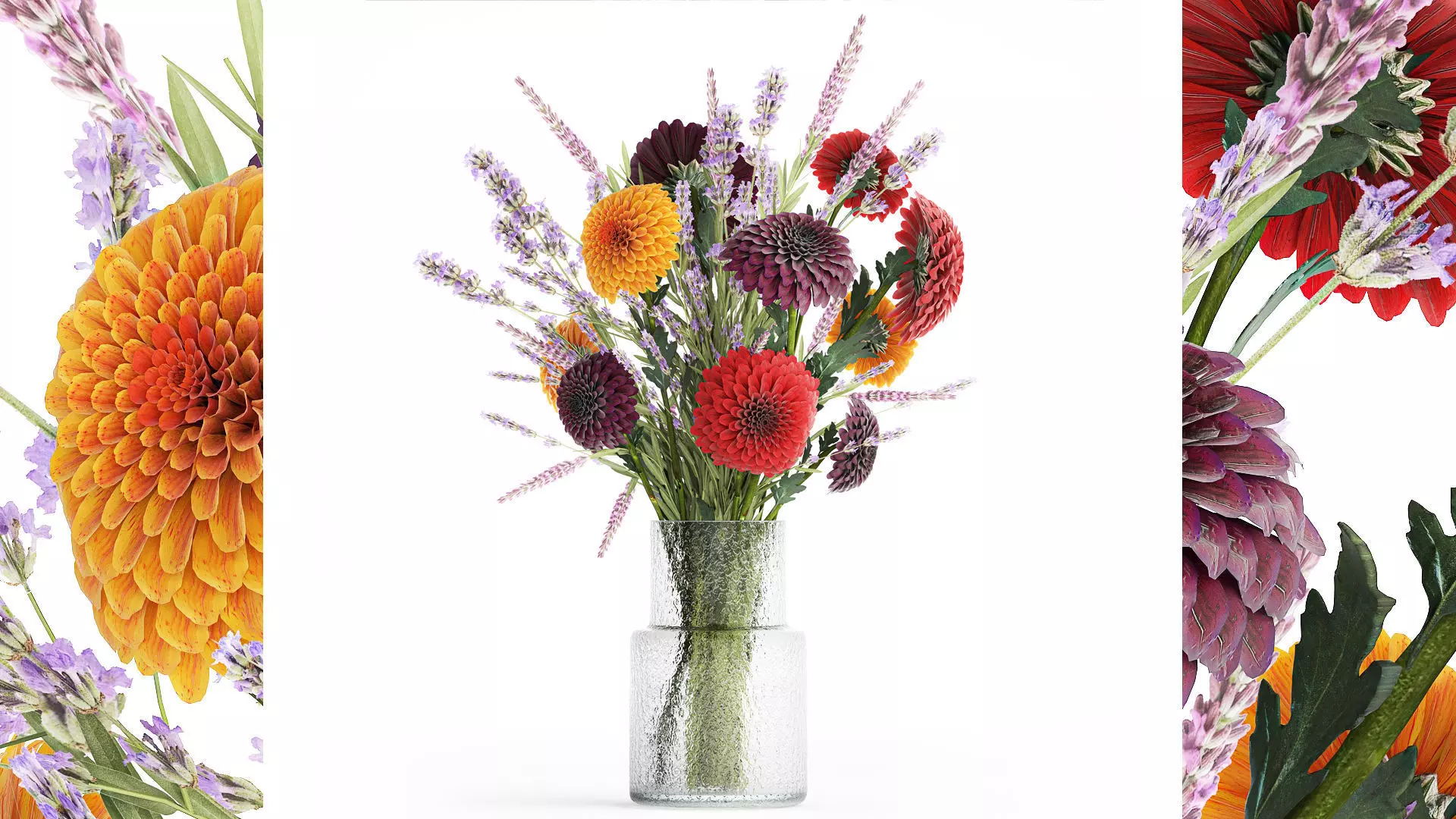 Collection of beautiful bouquets of colorful flowers in a modern glass vase from Chrysanthemum, Dahlia, Lavender. Set 396.Dahlias - Dahliaschrysanthemum, golden-daisy - ChrysanthemumSpring bouquetLavender - Lavandula, lavenderCatnip - NepetaSage - Salvia nemorosaBouquet of wild flowersvase