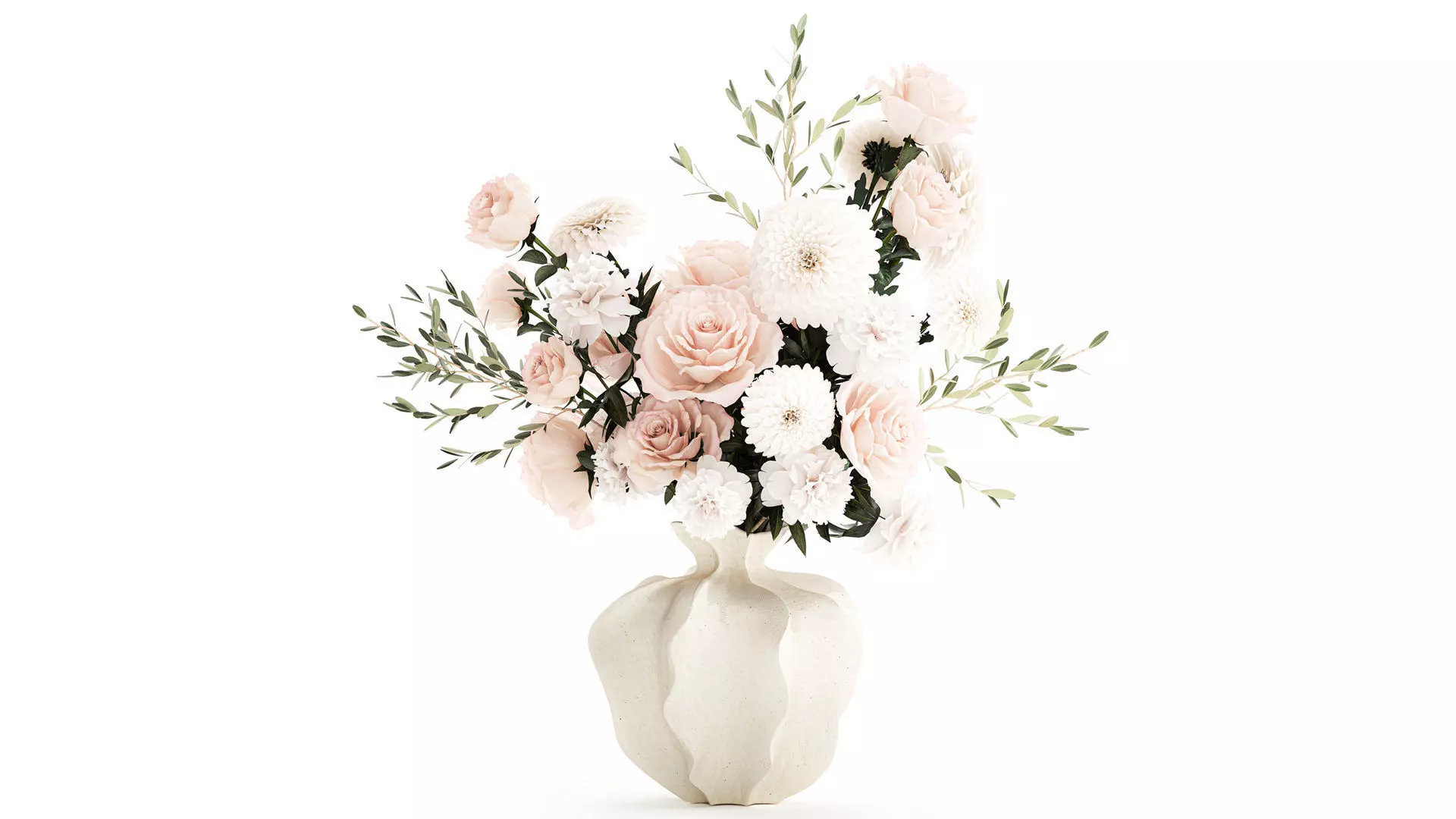 A realistic bouquet of white flowers with chrysanthemums, roses, peonies, and olives in a modern ceramic vase from H&M Home. Set 686.Decorative bouquet of white flowers in a ceramic vase for decor and interiors.Bouquet of branches and flowersBouquet of green leaves and branchesVase with branches, branches in a vaseSpring bouquetPaeonia, peony - PeoniesRose - pink and white rosesOlive branch in a vaseDahlia - DahliasChrysanthemum, golden-daisy - ChrysanthemumCeramic vase, monochrome, realistic, lush, festive, wedding decor, wedding bouquetAutumnVases - 2.hm, H&M HOME, hm, H&M, h&m
