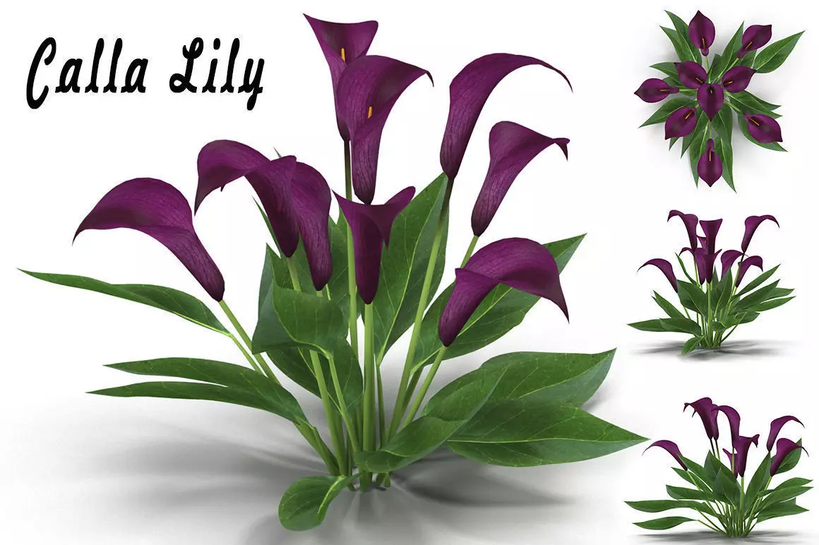 Photorealistic highly detailed 3D model of Calla Lily. Ideal for making variety in the interior and exterior scenes. All textures included. Final images rendered with vray.The scene also included a standard material (Scaneline).