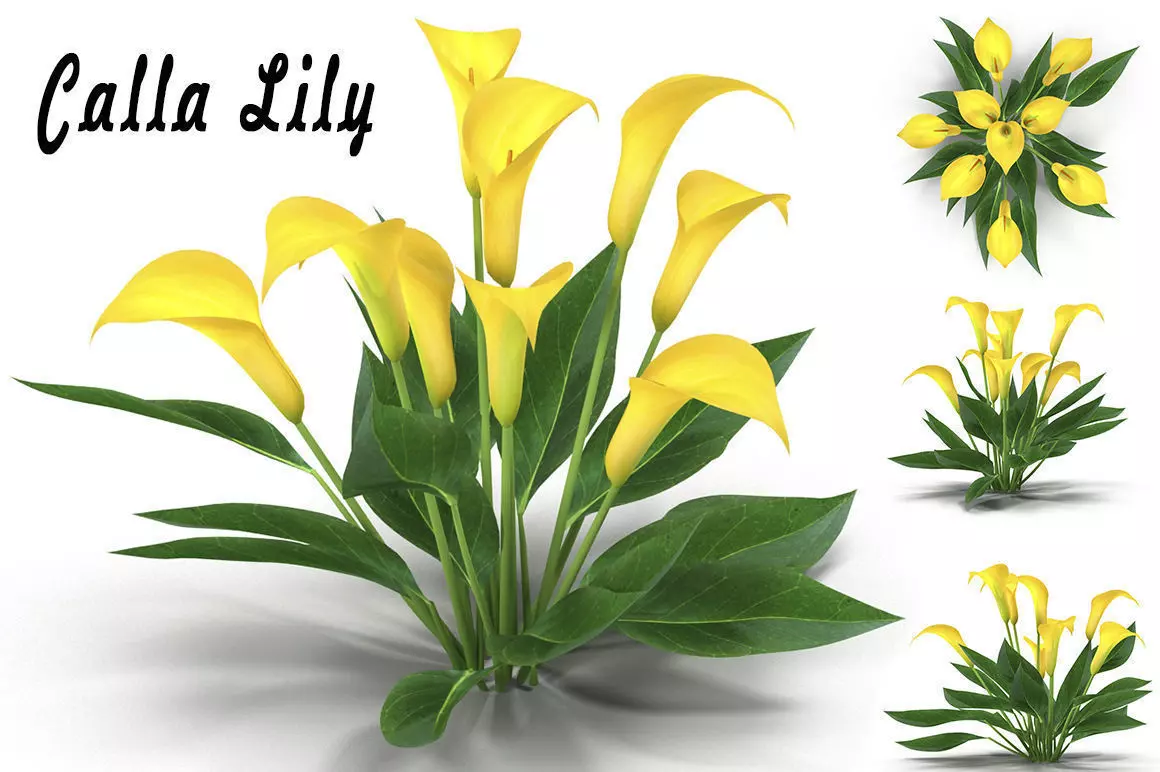 Photorealistic highly detailed 3D model of Calla Lily. Ideal for making variety in the interior and exterior scenes. All textures included. Final images rendered with vray.The scene also included a standard material (Scaneline).
