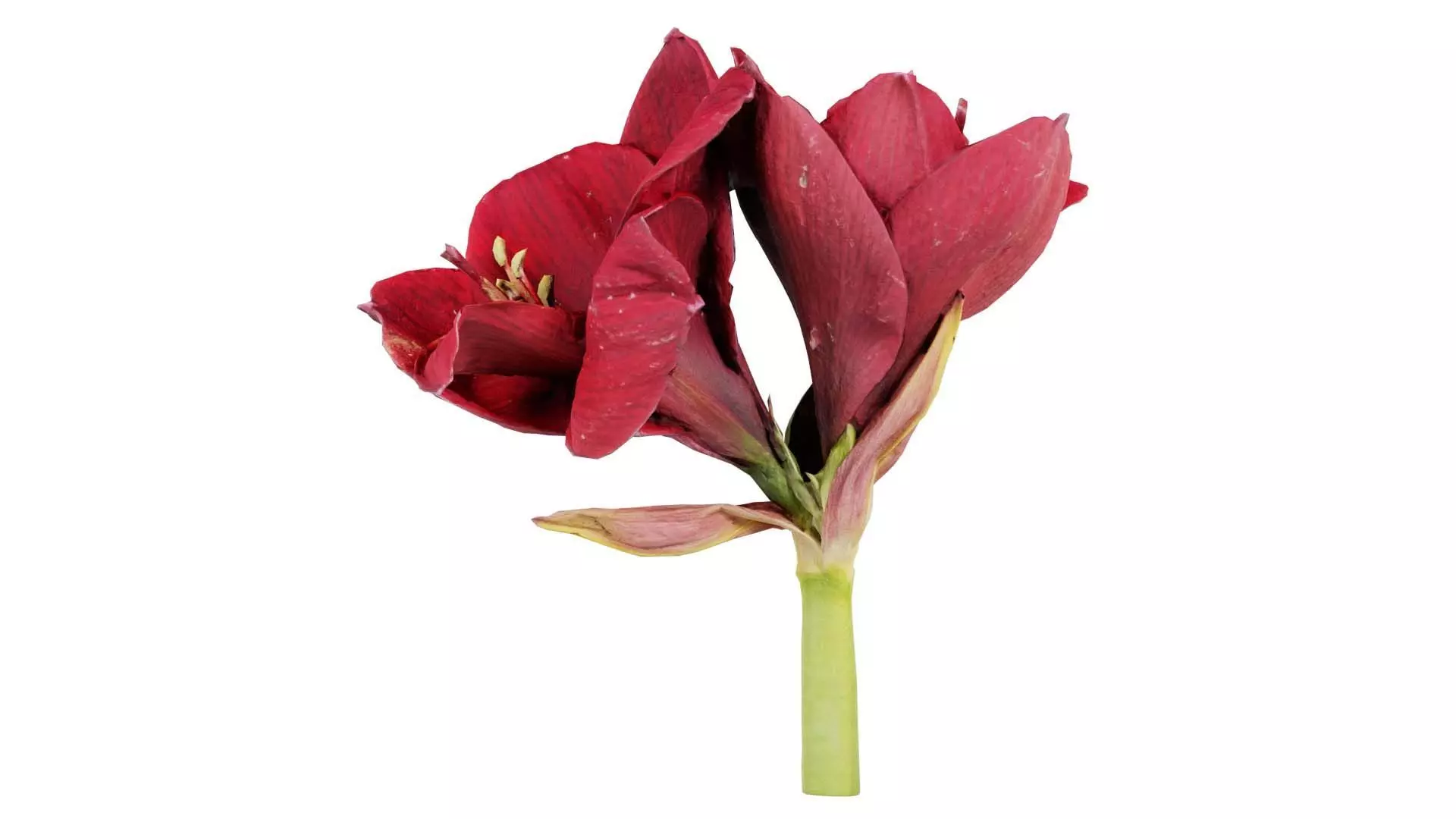 3D scanned model featuring two red flowers are on a stem. This model, close up belladonna lily jersey march ladies amaryllis, has been created using photogrammetry from a real world object.The raw scan data has been cleaned, retopologized and UV-unwrapped using Zbrush. The result is a low poly mesh with baked maps. The .obj and .mtl are configured so that maps will load automatically in the shader (tested in Blender). In addition, a Blender scene is provided with the model and shader already set up for rendering and export. Detailed information below: