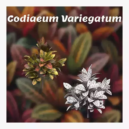 Description: This 3D model of Codiaeum variegatum, commonly known as the Croton plant, is designed with realistic detail, perfect for use in various digital environments such as interior design visualizations, landscaping projects, and virtual nature simulations. The model showcases the vibrant, multi-colored leaves that this plant is known for, with various shades of green, yellow, red, and orange, mimicking the natural beauty of the plant.