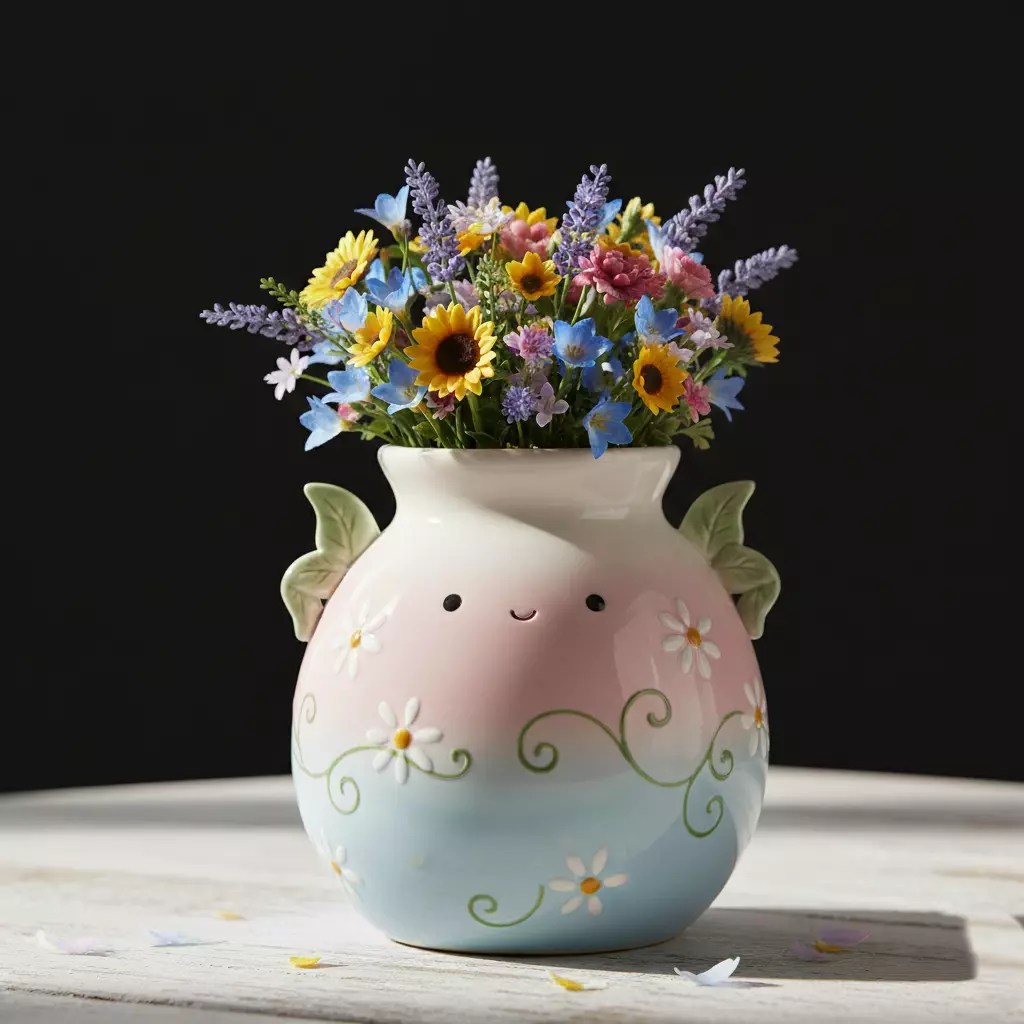Bring a touch of whimsical magic to any room with this adorable Cute Whimsical Face Vase. This unique design features a soft, pastel ombre aesthetic that transitions seamlessly from pink to blue, decorated with sweet daisy accents and swirling vines.