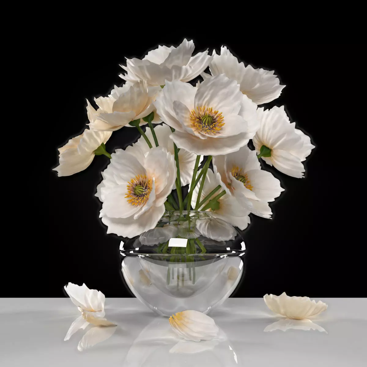 white poppies are arranged in glass vase designed in 3dsmax.