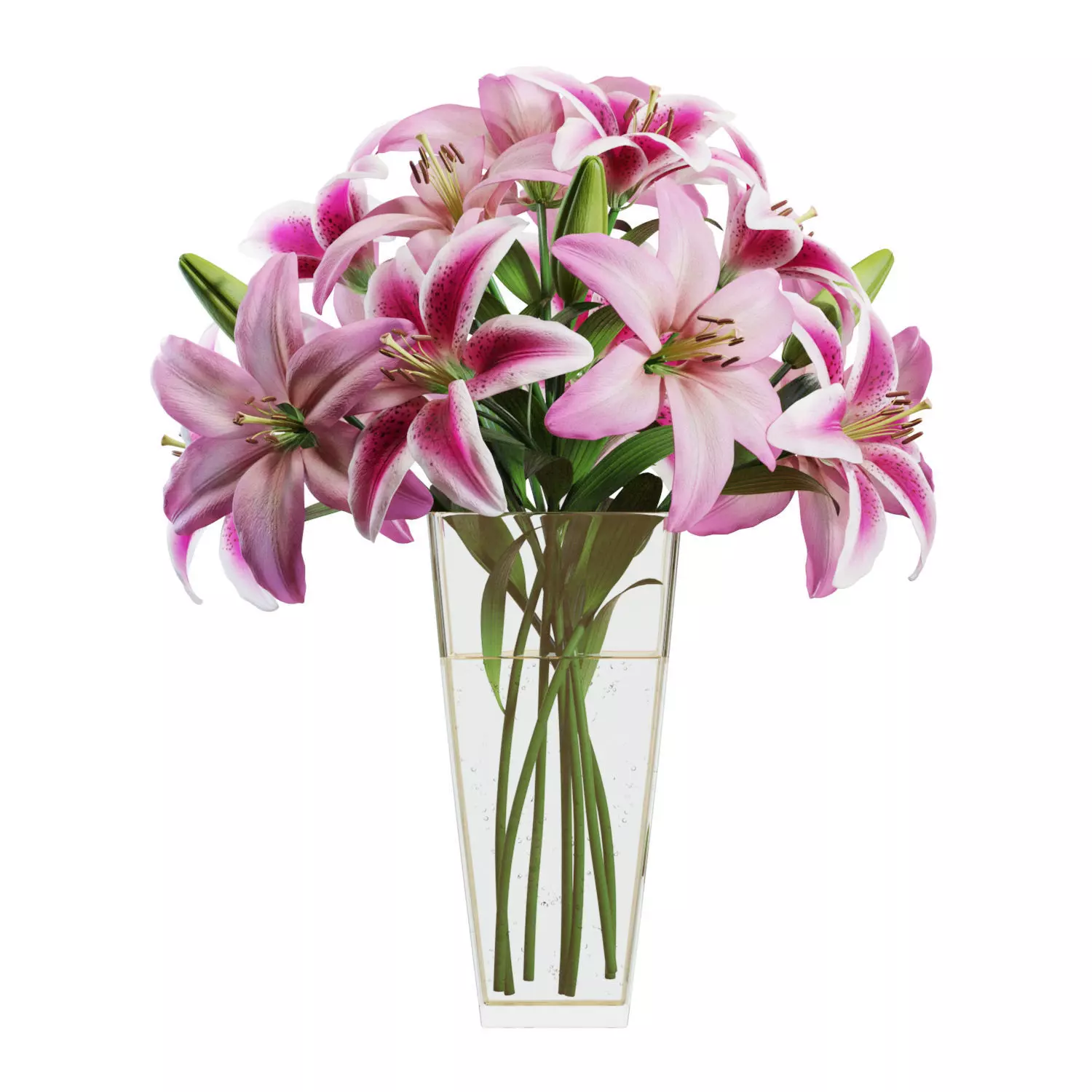 High-quality 3d model of a Pink Lilies Bouquet in a glass vase. 7 flowers.The model is fully subdividable.