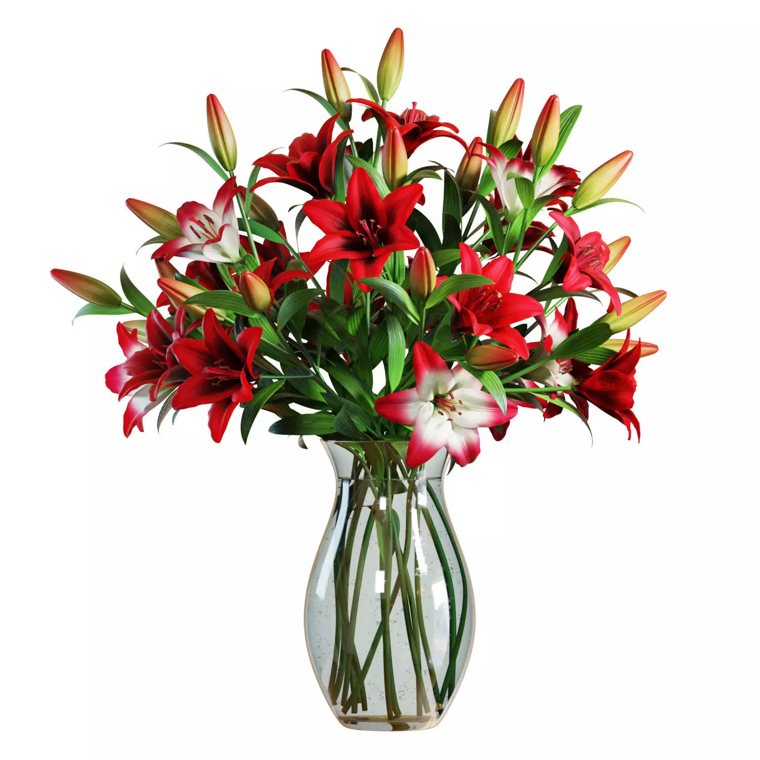 High-quality 3d model of a Red Lilies Bouquet in a glass vase. 15 flowers.The model is fully subdividable.