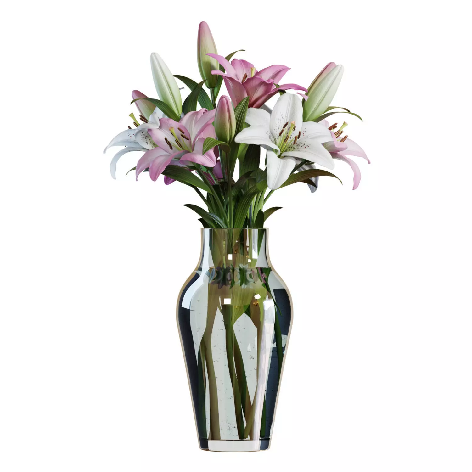 High-quality 3d model of a Pink and White Lilies Bouquet in a glass vase. 7 flowers.The model is fully subdividable.