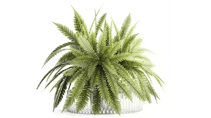 Stylish green floral bouquet of fern branches in a modern glass vase. Set 651.Bouquet of branches and green flowersStylish modern realistic bouquet of asparagusvasenephrolepis, fern - fern