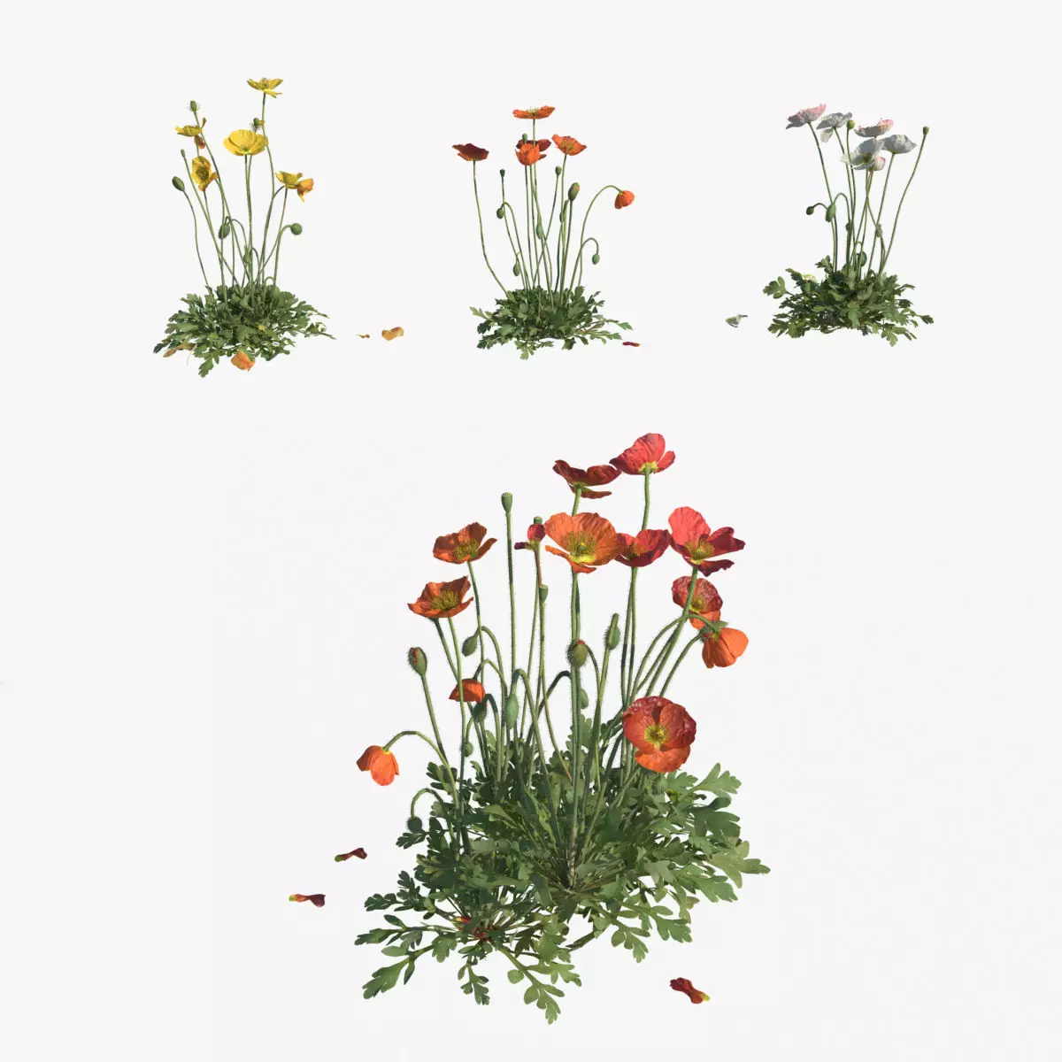 This is a pack of Iceland poppy models with 19 varying variants, made with Blender 2.91. There are high, medium and low polys available. PBR textures are applied.