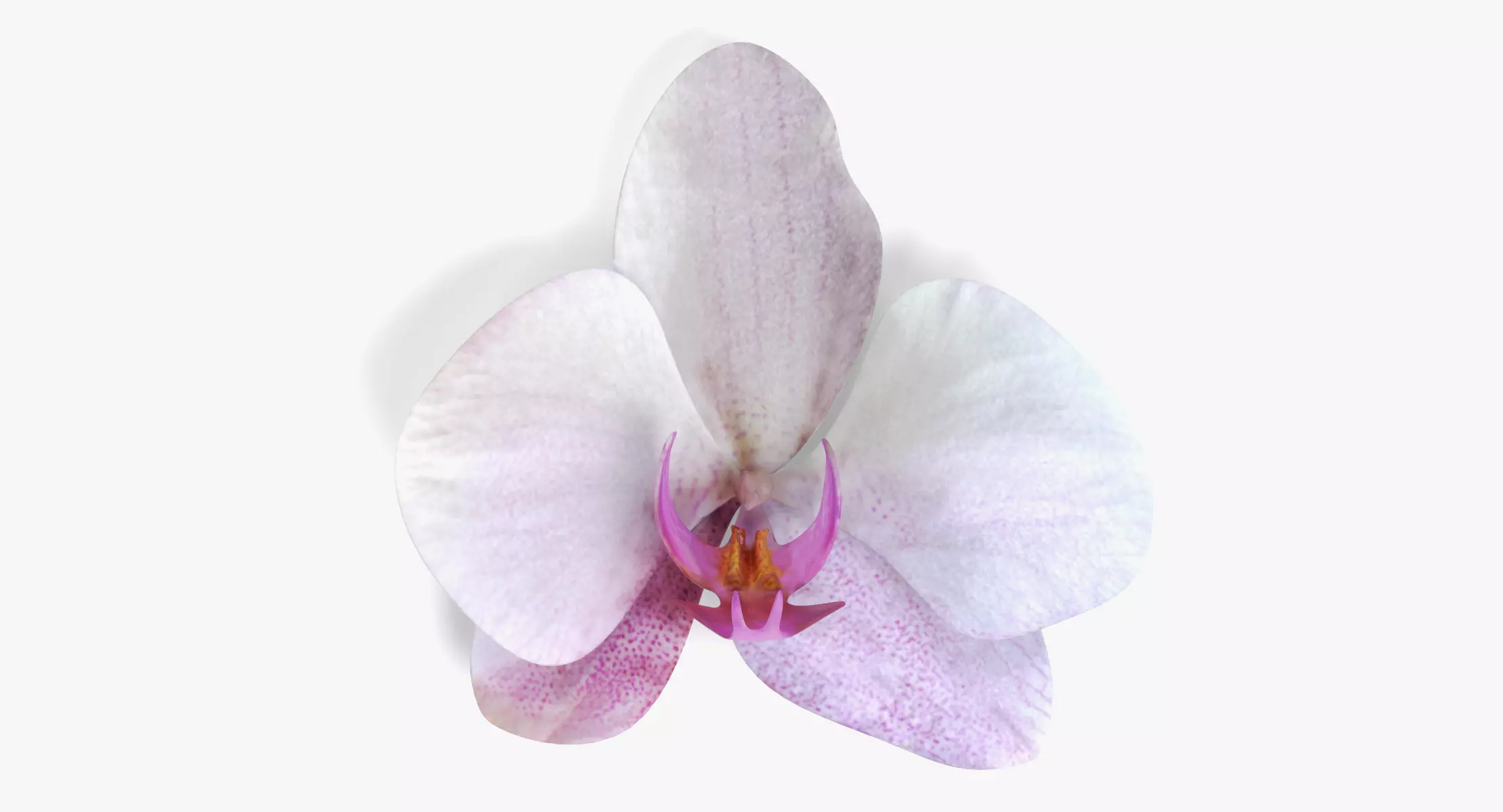 A single blooming orchid flower 3D model with a short cut stem. The bloom is modeled with layered petals and a clearly defined inner structure, keeping a neutral botanical look suitable for close-up use. Hand-built geometry and original textures allow the flower to be used as a standalone decorative element or integrated into custom plant setups.