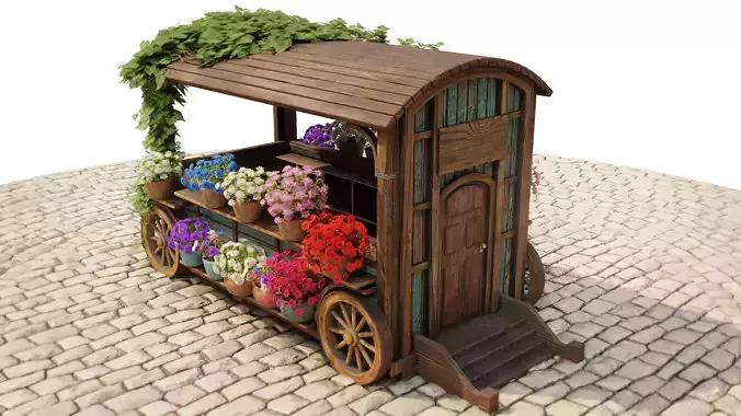 The caravan features a variety of aged wood materials, chipped painted surfaces, subtle cracks, and metal reinforcements that add realism and character. Decorative ivy vines climb along the structure and roof, while colorful floral arrangements in terracotta and painted pots bring vibrant life to the scene.Optimized for real-time rendering and game-ready workflows, this asset includes foliage and flower cards suitable for efficient vegetation placement. Ideal for use in games, cinematics, dioramas, and concept environments.
