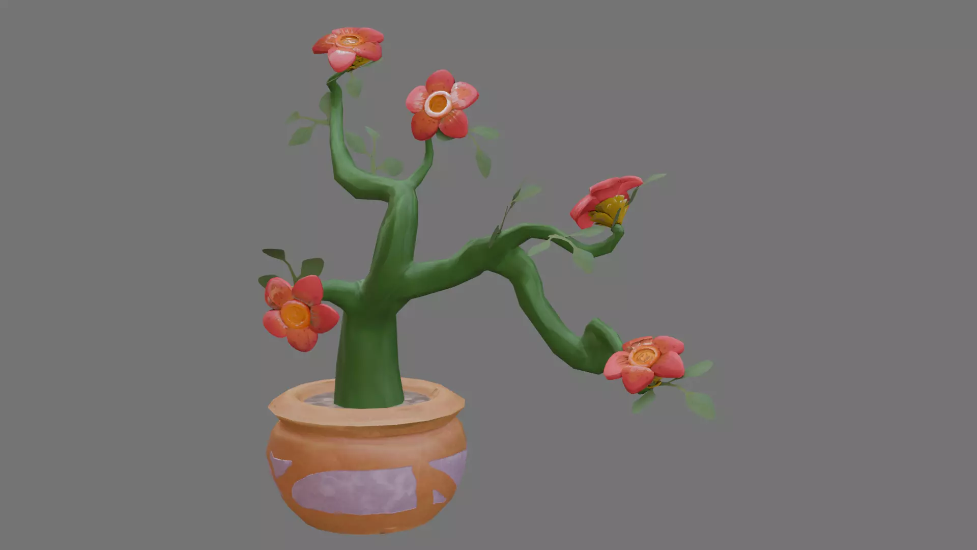 A stylized botanical plant inspired by the massive Rafflesia flower and twisting rambling vines. Thick curving branches grow outward like a living sculpture, crowned with oversized coral-pink blossoms and soft rounded leaves. Designed with smooth exaggerated forms for a whimsical, storybook feel, this fantasy flora piece is perfect for cozy dioramas, decorative scenes, and stylized environments.