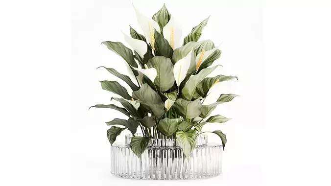Modern realistic bouquet in a glass vase of green leaves with white Spathiphyllum. Set 614.Beautiful small formal bouquet of monochrome flowers in a modern glass vaseSpring bouquetSpring bouquetSummer bouquetWedding decormonochromevasedelicateSpathiphyllum - Spathiphyllum